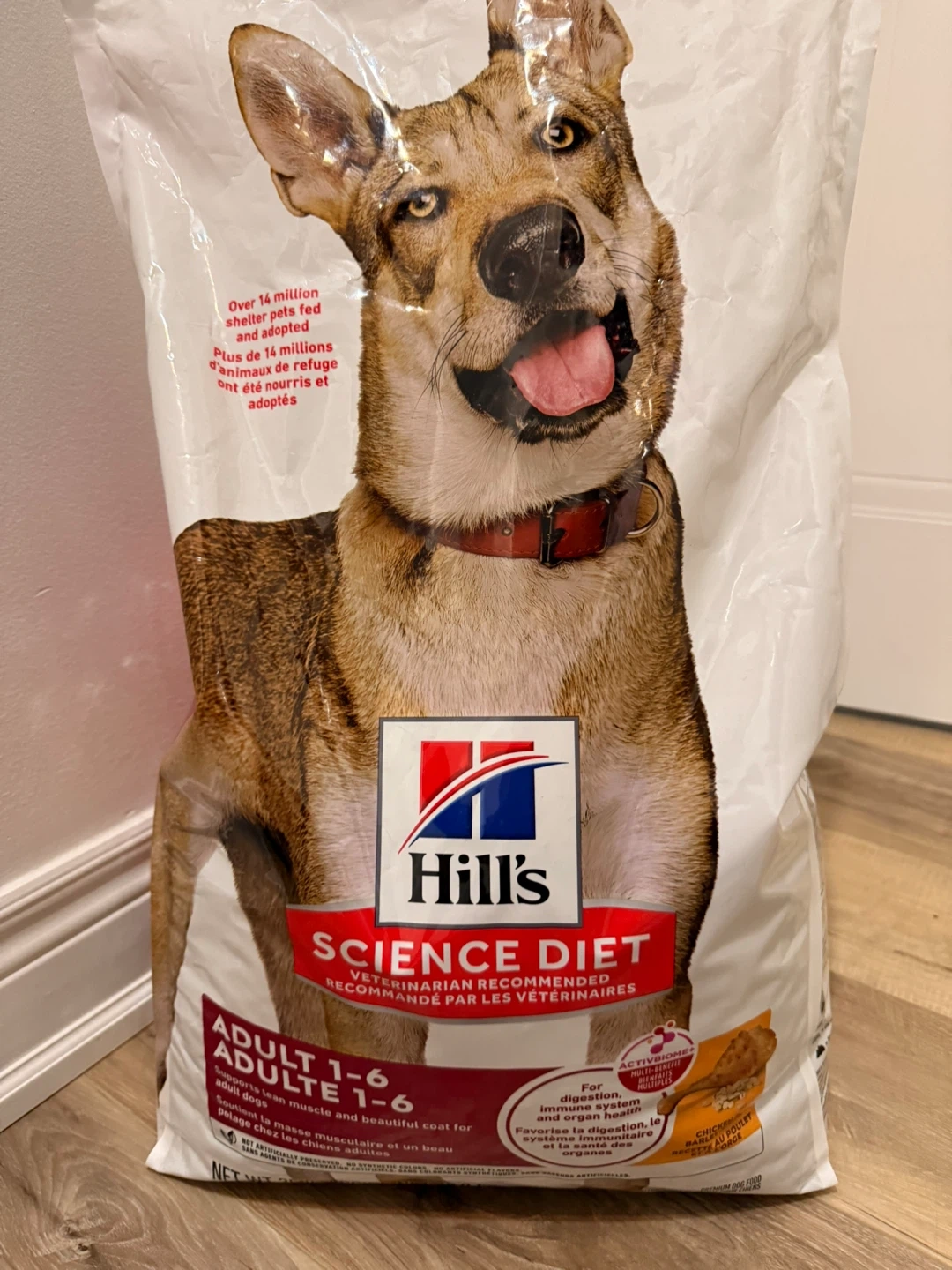 I have a bag of Hill's Science Diet Adult 1-6 dog food available. It's veterinarian recommended and helps support lean muscle and a beautiful coat for adult dogs. Perfect for dogs aged 1-6! *bag is opened because we fed our dog twice but it is a full bag*