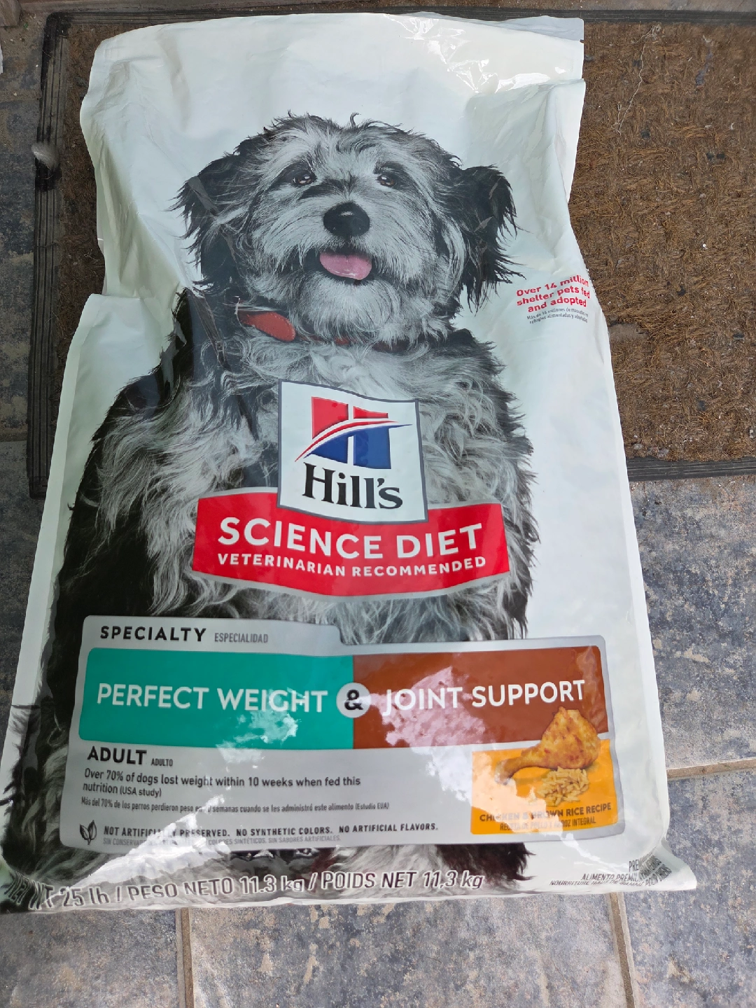 Selling a bag of Hill's Science Diet dog food, perfect for adult dogs needing weight management and joint support! This is the adult formula. It's a chicken and brown rice recipe. Over 70% of dogs lost weight within 10 weeks when fed this nutrition