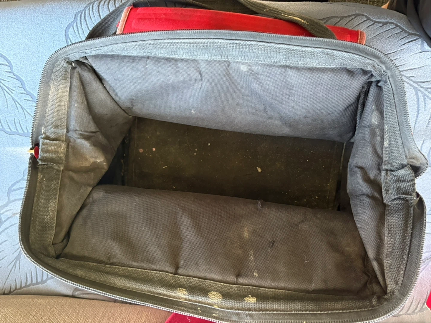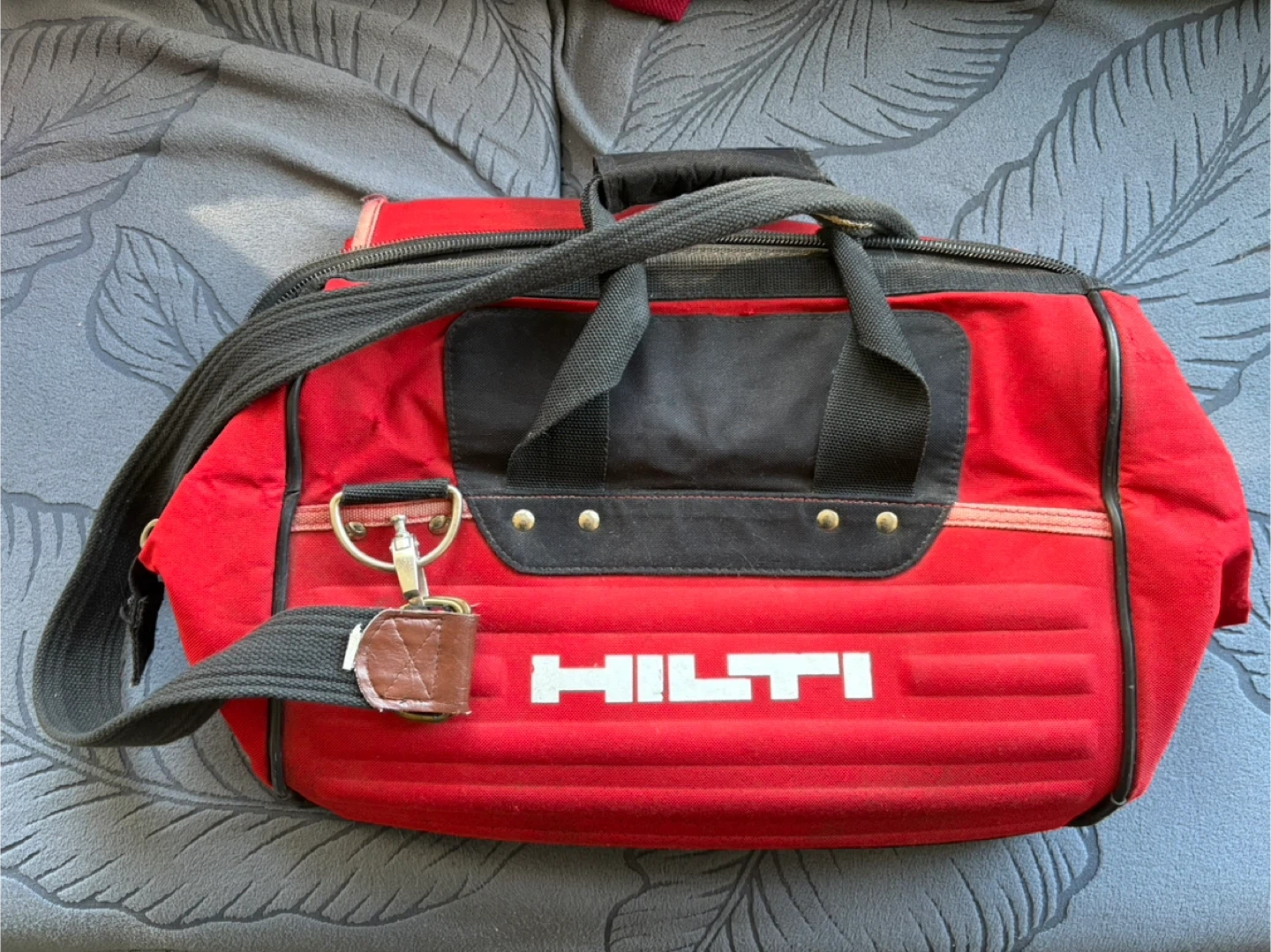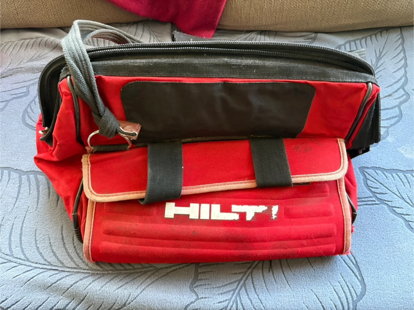 Selling a Hilti tool bag in red and black. It has some signs of use, but is still functional and ready to hold your tools!