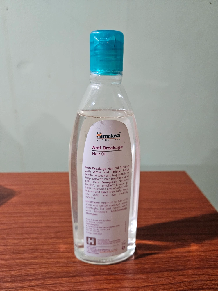 Selling a bottle of Himalaya Anti-Breakage Hair Oil. It's a hair oil fortified with amla and thistle. It helps resist breakage and revitalize weak and fragile hair. Contains lecithin, an emollient known to help moisturize and condition hair. Size is 6.76 fl oz / 200 ml
