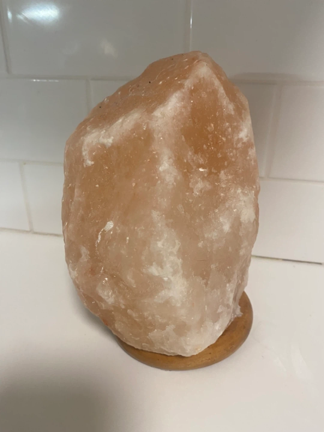 Selling a Himalayan salt It has a beautiful, natural pink hue and sits on a wooden base. It gives off a warm, calming glow that's perfect for creating a relaxing atmosphere in any room