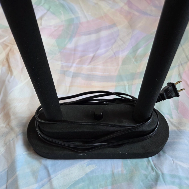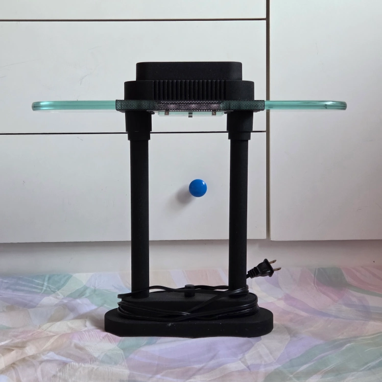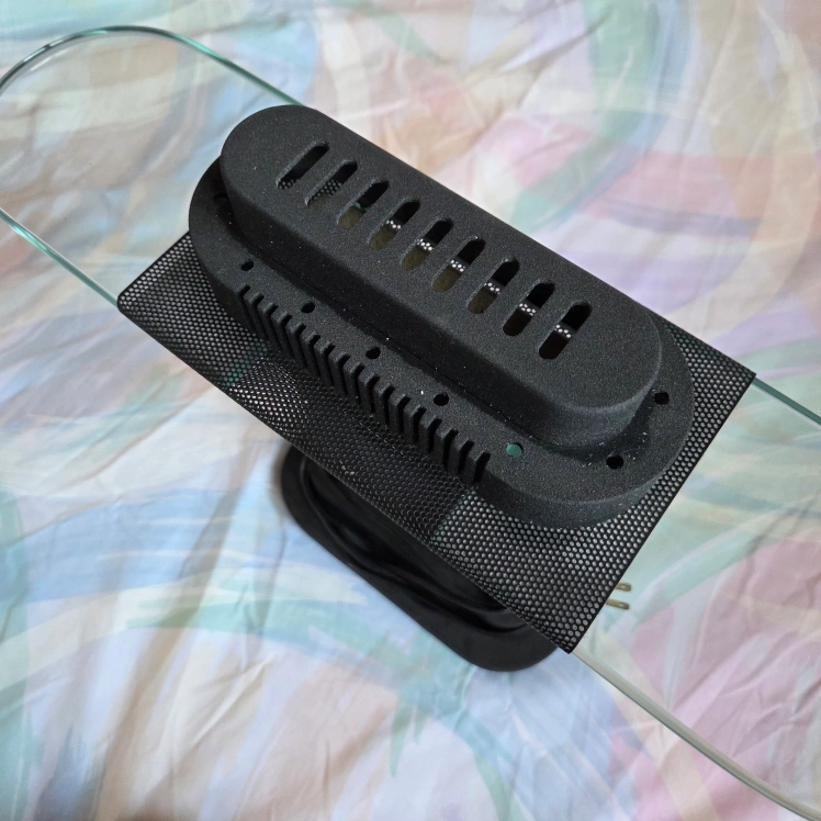 Design has a strudy black base, light dial in the centre, a mesh screen and a thick glass accent at the top