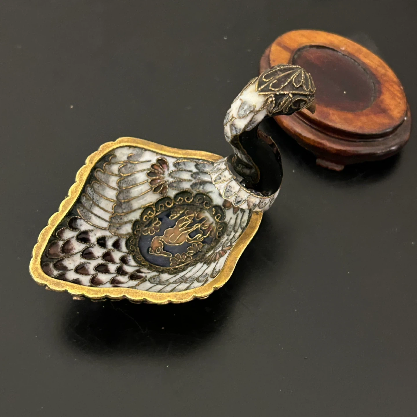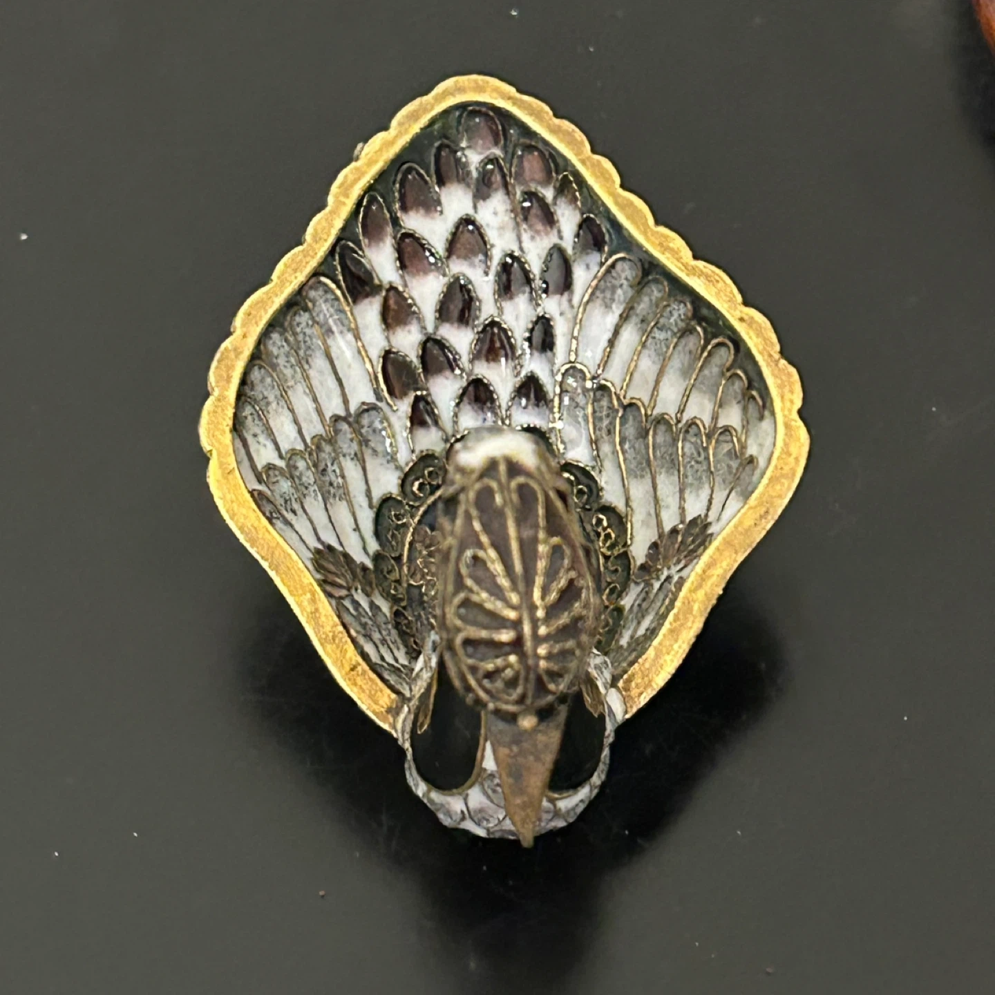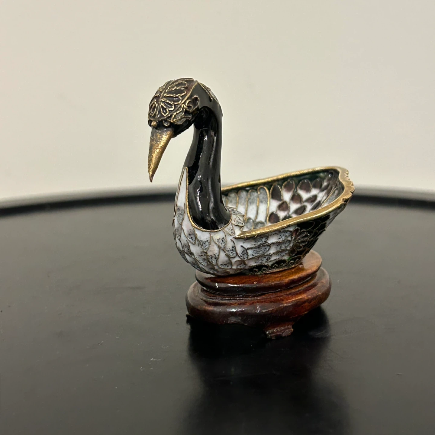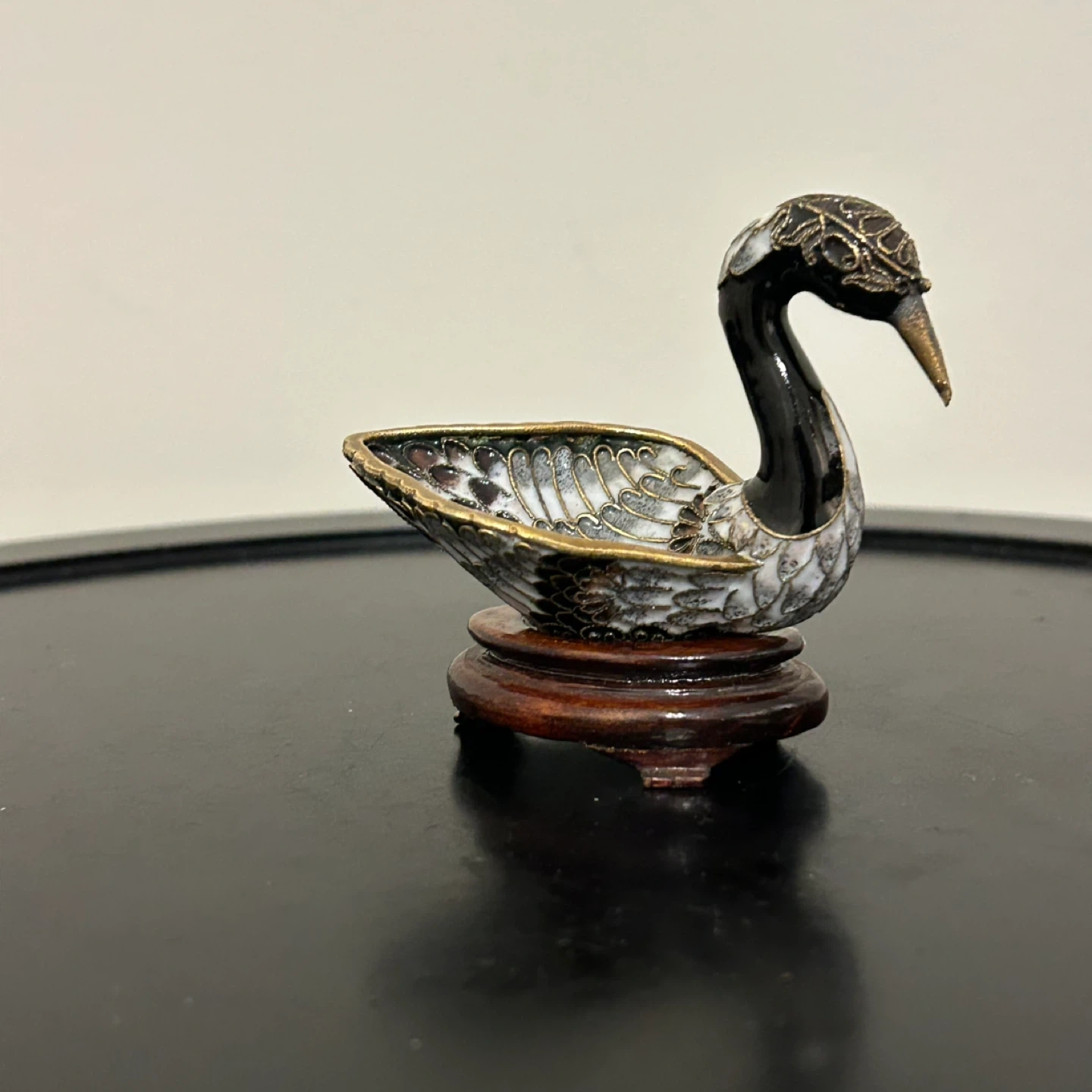 A beautiful vintage cloisonné swan trinket dish, crafted in the traditional Chinoiserie style. This elegant piece features fine brass wirework (cloisons) filled with rich enamel in white, black, and deep burgundy/plum tones. The wings are detailed with a textured “feathered” pattern, and the interior bowl showcases a delicate enameled bird motif — a charming and less common decorative touch.
