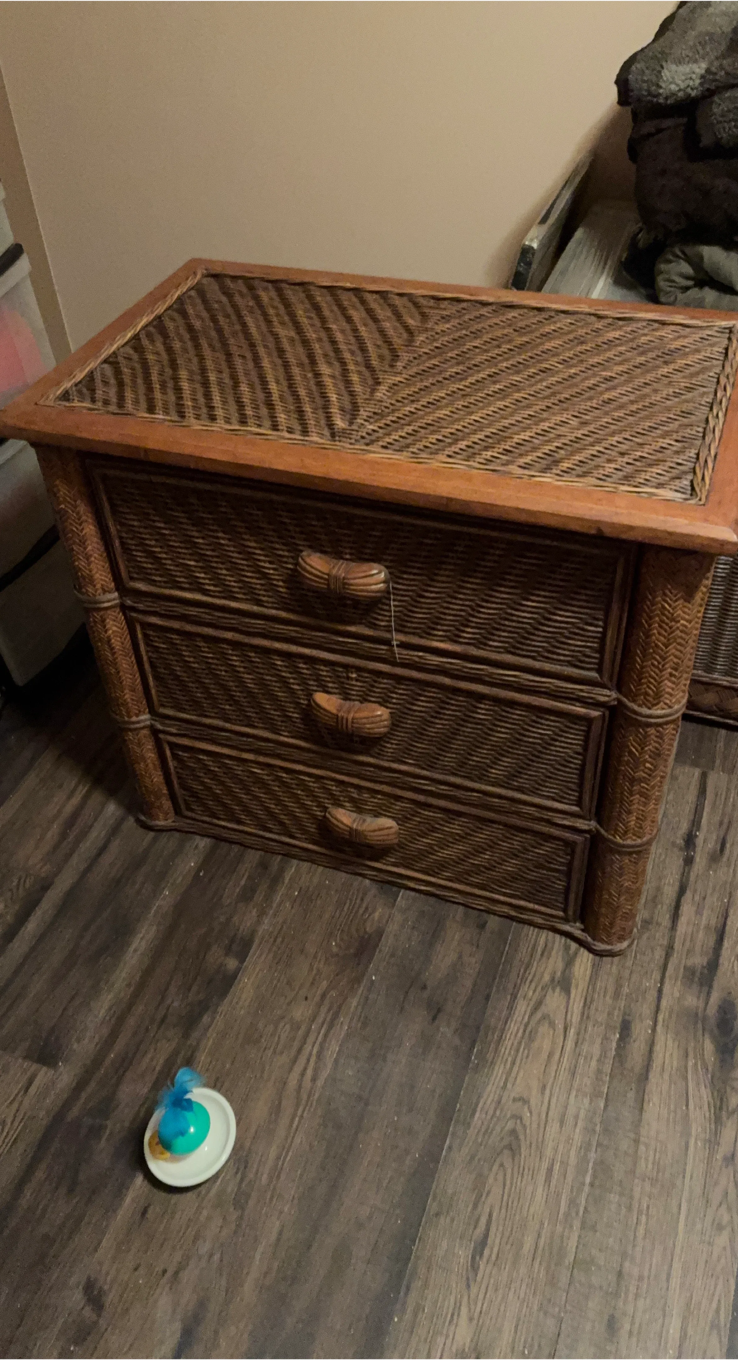 Wicker dresser with three drawers. Its woven design offers a rustic feel. This piece is perfect for storing various items in a bedroom or living space.