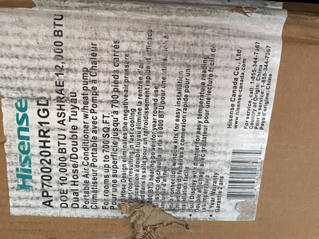 86Keep cool this summer with a Hisense 12,000 BTU ASHRAE portable air conditioner with heat pump! Designed for rooms up to 700 sq. ft, this unit features a dual hose design for efficient cooling and can also be used as a heater during the colder months. The condition of this item is new, never been used. Key features: * 12,000 BTU ASHRAE * Dual Hose Design * Portable Air Conditioner with Heat Pump * For rooms up to 700 sq. ft And hey, just a friendly heads up—if you're seeing this ad, it means the AC is still up for grabs!