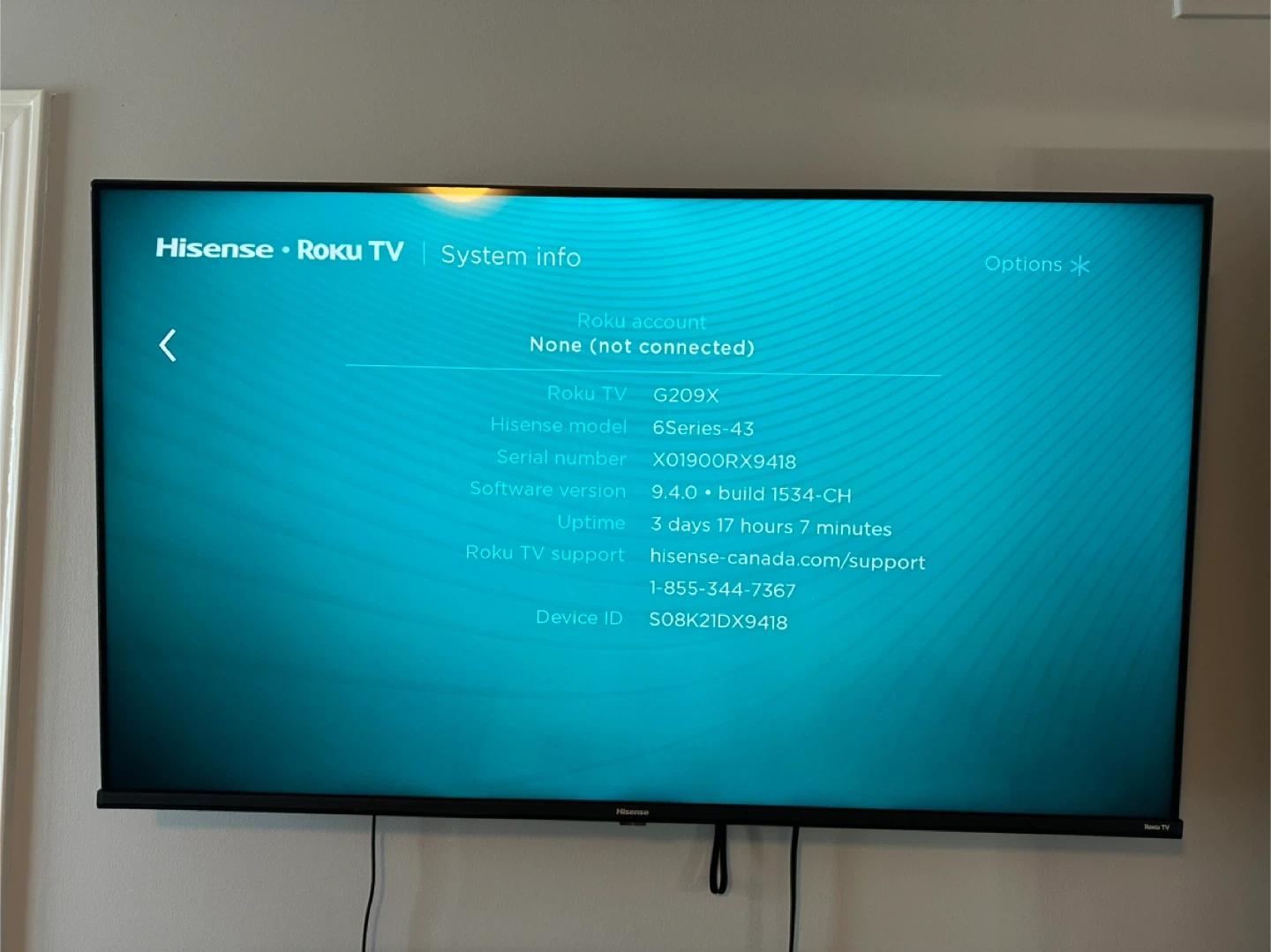 Selling a Hisense 6Series-43 inch 4K Roku TV. Small dim spot that is only noticeable during bright white scenes, otherwise not visible. Does not come with legs. Fantastic deal for a 4K TV, come and get it!