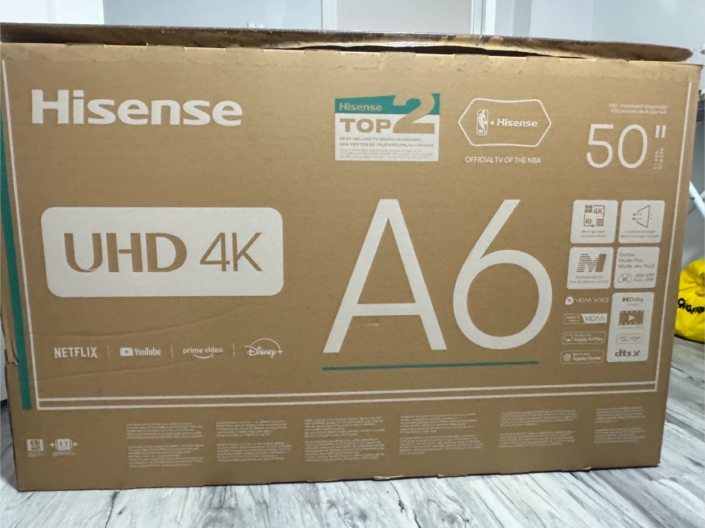 60Selling a Hisense 50-inch 4K UHD Smart TV from the A6 series. It's in great condition and comes with the original box. Giving away with the table!!