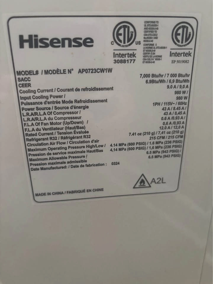 15I’m moving out so I’m going to be selling a bunch of items! This portable AC unit was bought last summer, so used 2 summers. It is Hisense Model AP0723CW1W. Single hose 7000BTU Good for up to 300 sq feet.