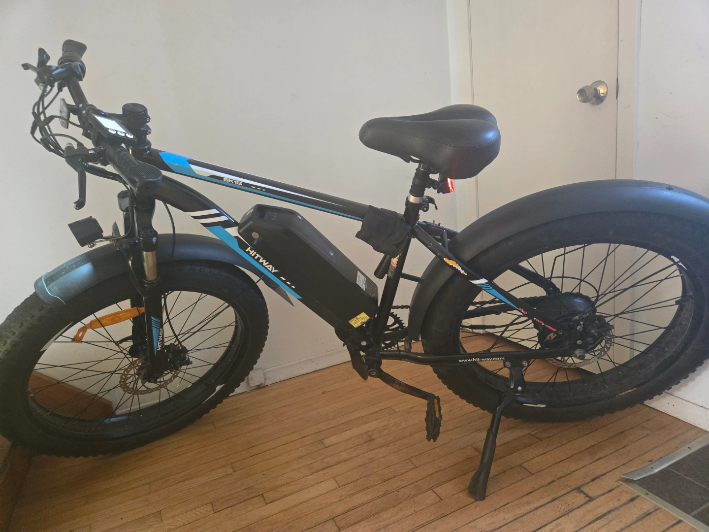 71Pre-owned electric bicycle. Fat tires, black frame with blue accents. Includes fenders and kickstand. Good condition. Issue is with the motor. Looking to sell as a whole or for parts. Battery and every other thing is in excellent condition save for the motor. Moving soon so I'm selling this.