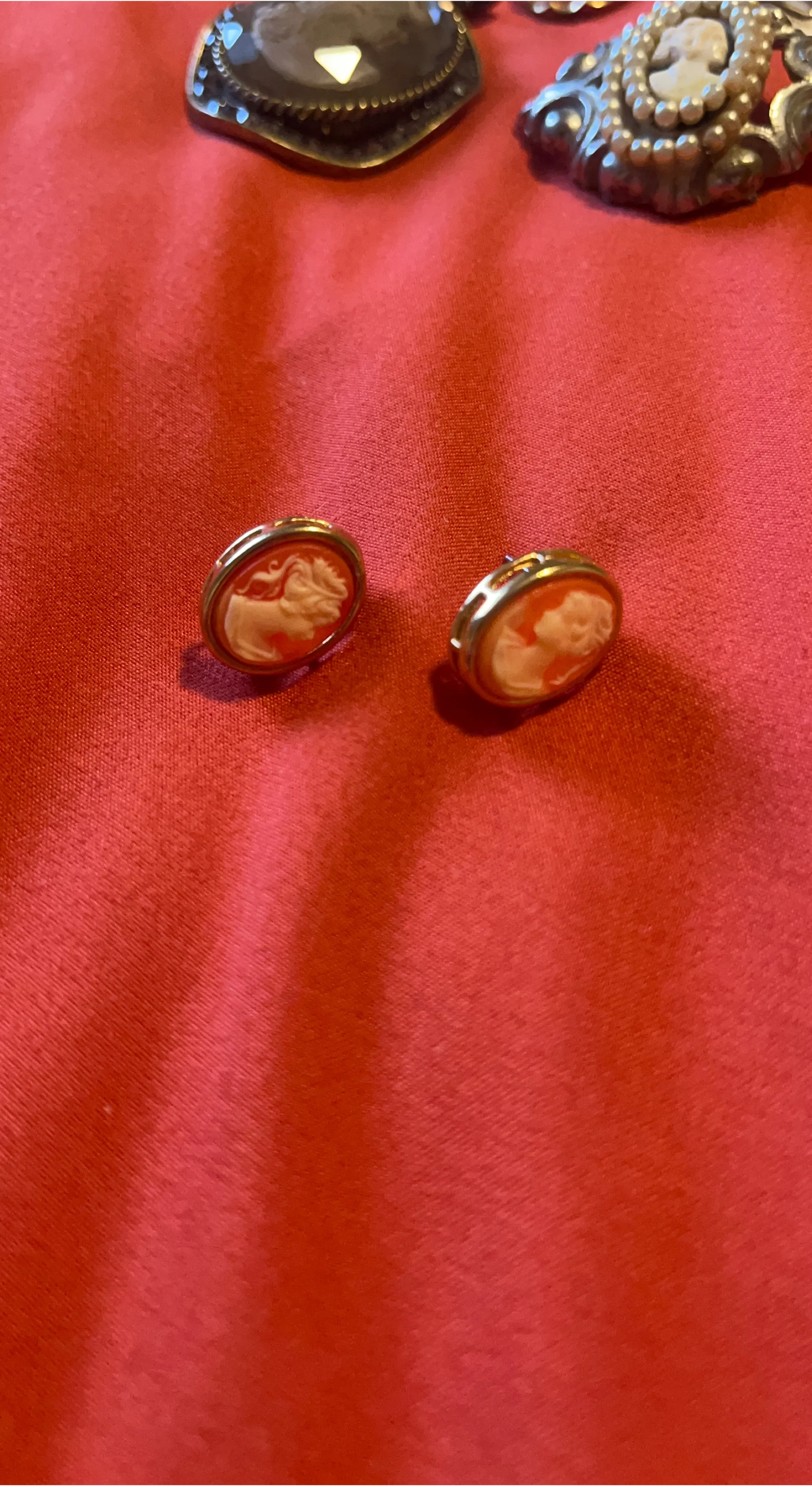 These are a pair of vintage cameo earrings. They feature an oval-shaped cameo with a profile of a woman. The setting is gold-toned metal.
