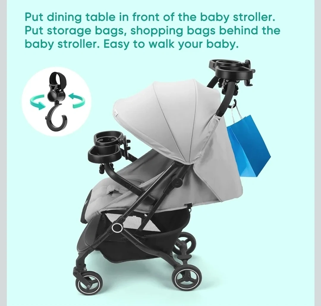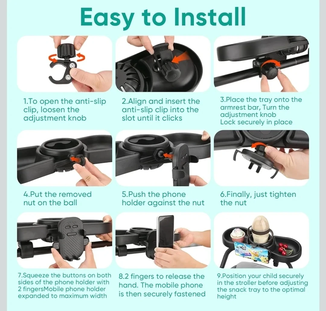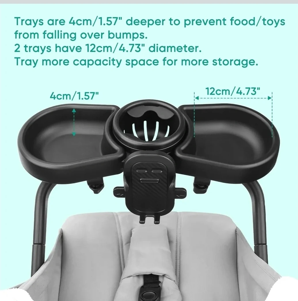 This is a 4-in-1 universal stroller snack tray with food, water cup, toy zones and a mobile phone holder. It's made from high-quality ABS material, BPA-free, and easy to clean. The tray offers convenient storage for snacks and drinks while on the go.