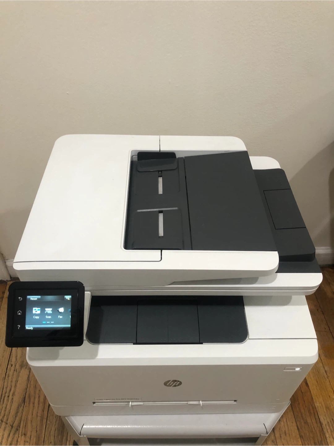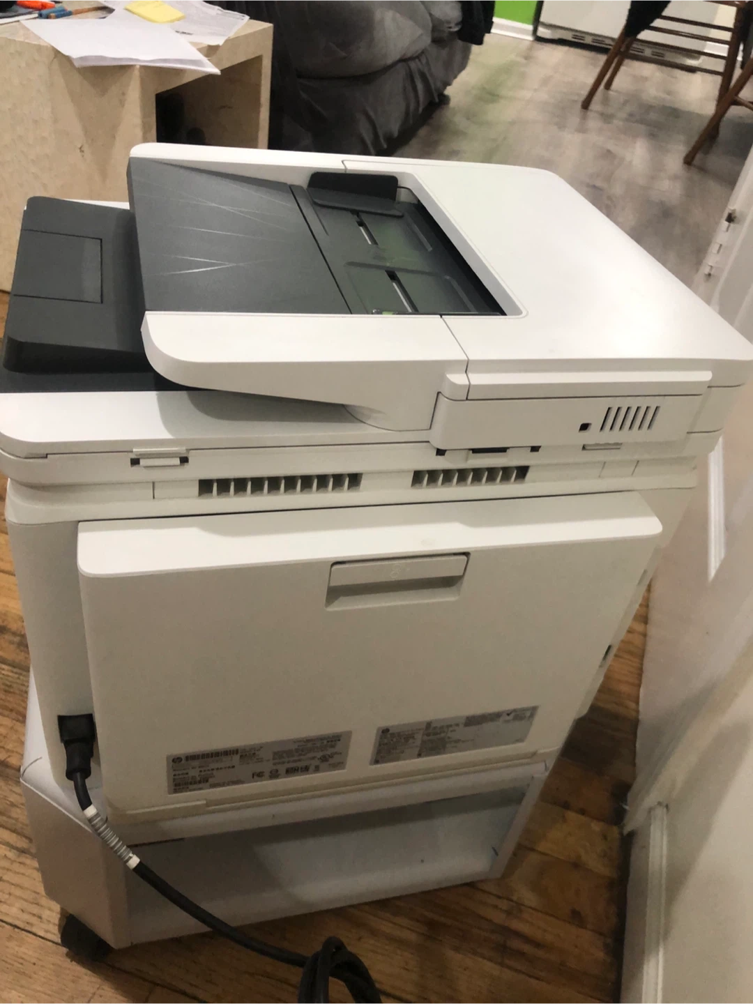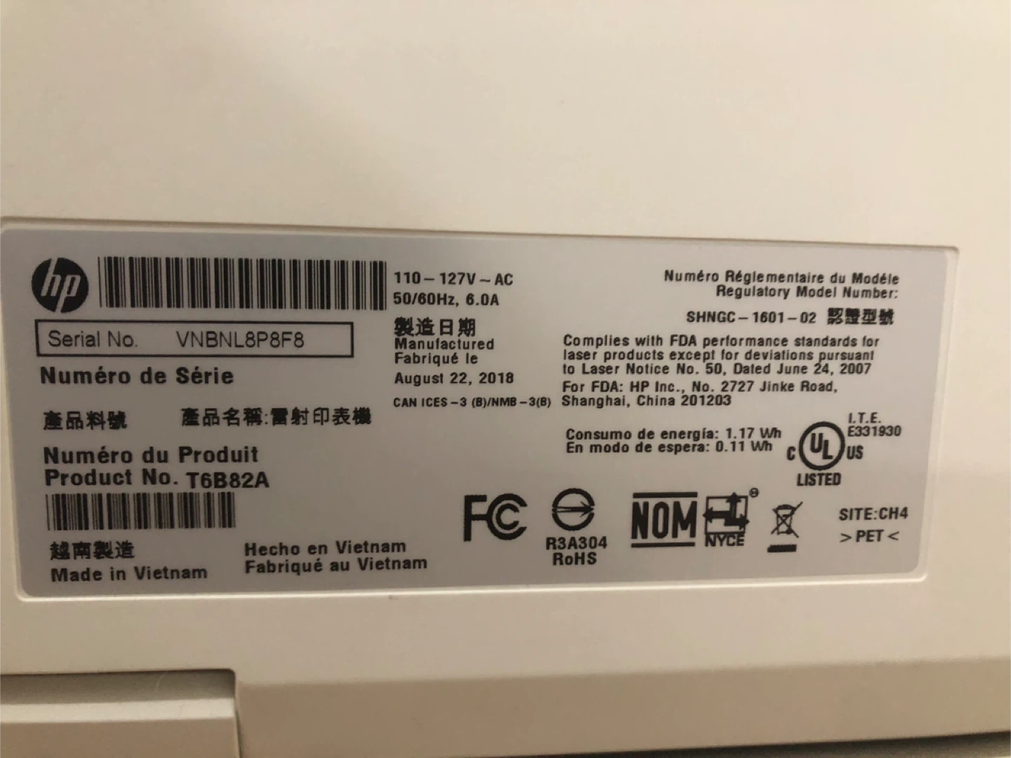 HP LaserJet Pro MFP M428fdw printer. Manufactured August 22, 2018. Includes scanner, copier, and fax functions. This is a monochrome laser printer.