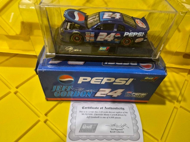 Own a piece of racing history with this Jeff Gordon #24 Pepsi Racing 1/43 scale diecast car, a Revell Collection collectible. The car is mounted on a display stand inside a clear plastic display case, and includes its original box and certificate of authenticity. This item is in used, good condition. It's a 1/43 scale diecast replica of the '99 PEPSI Chevrolet Monte Carlo driven by Jeff Gordon. Only 4,008 pieces were made. Cash accepted.