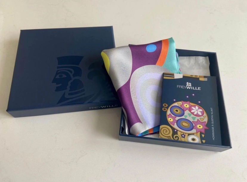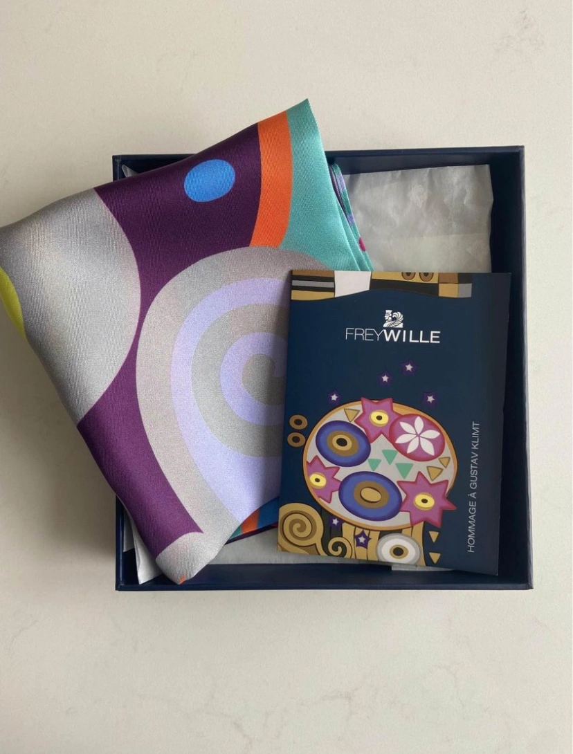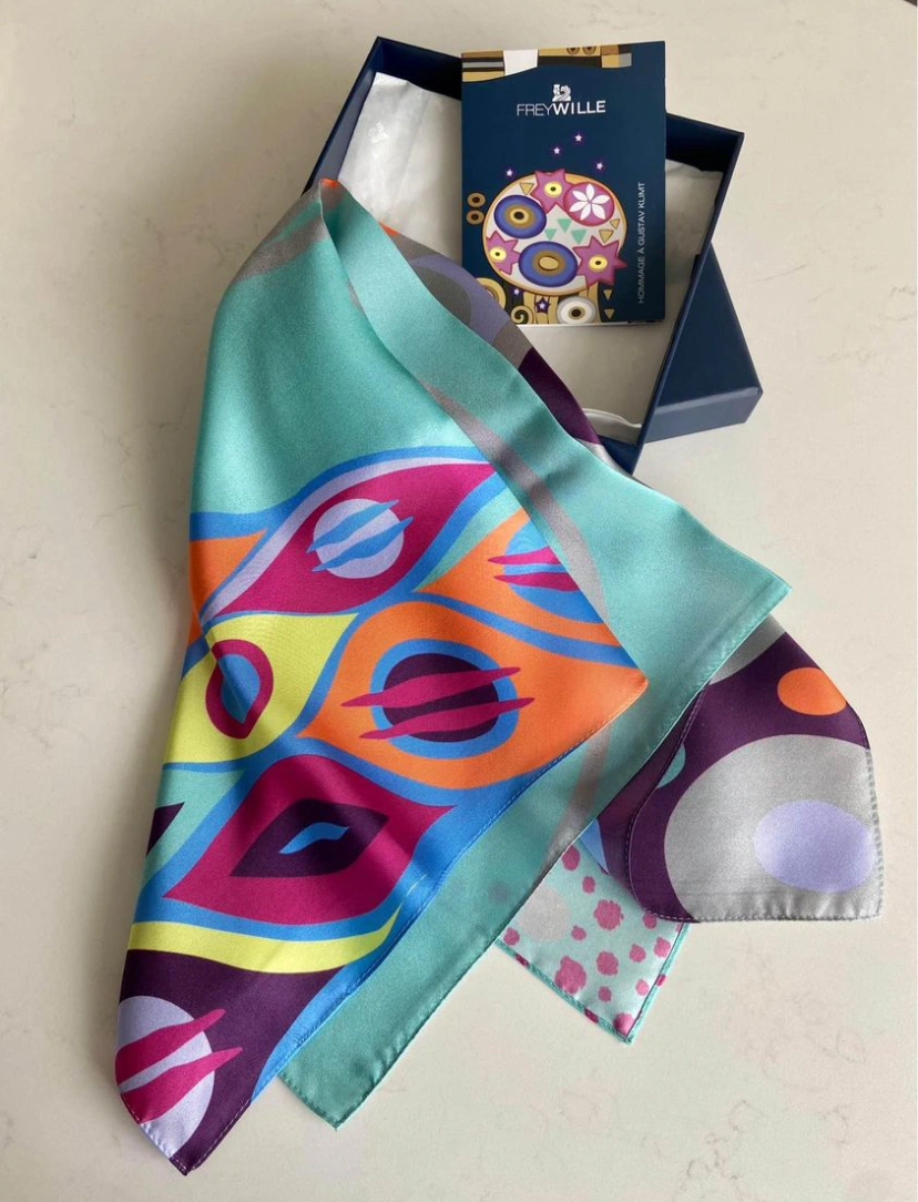 Price is firm. Brand new pure silk FREYWILLE gavroche / scarf - Hommage à Gustav Klimt. Size 53 x 53 cm. Retails for $215 + tax. Could be an excellent gift!