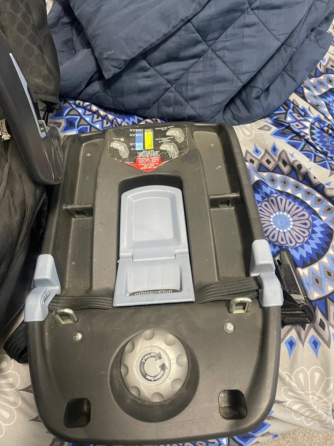 Infant car seat and base for newborns. Features a 5-point harness system for security. Made by Peg P3r3go. Includes the car seat and its corresponding base.