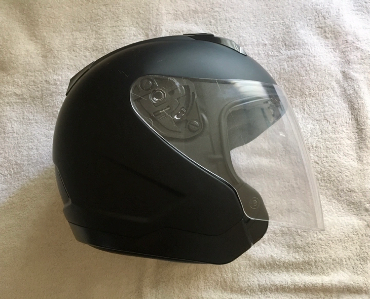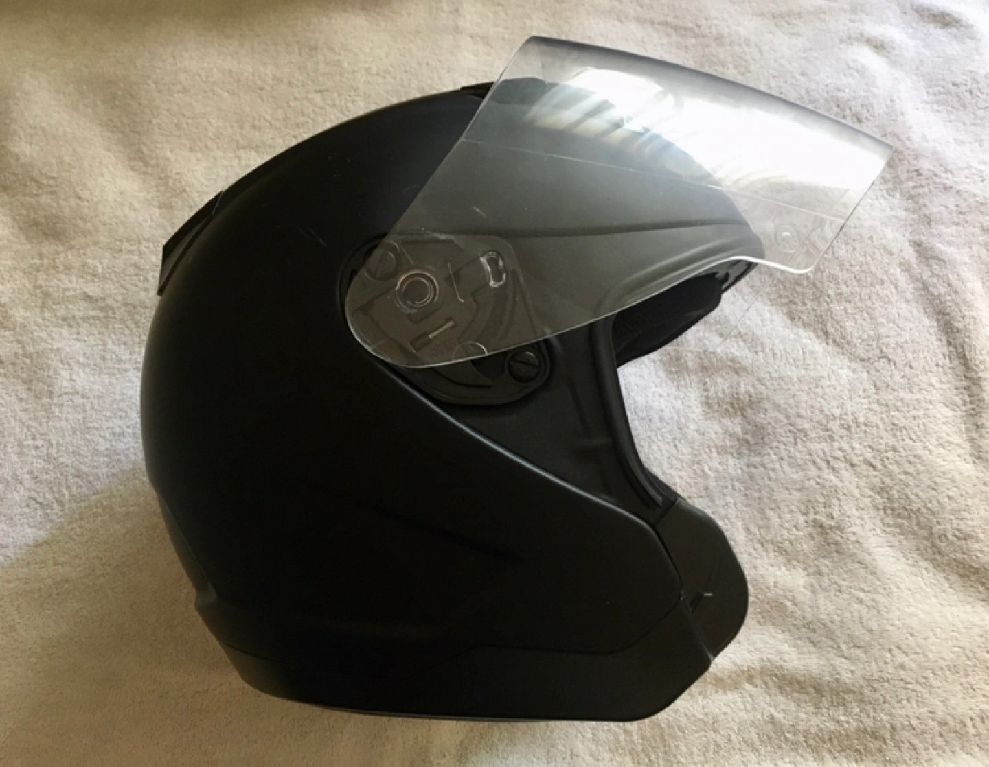 76- Matte black colour - DOT certified - Removable and replaceable face shield, no tools required - Drawstring totebag included - Worn only twice, a few tiny abrasions but great condition overall