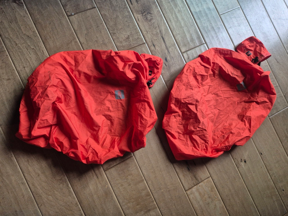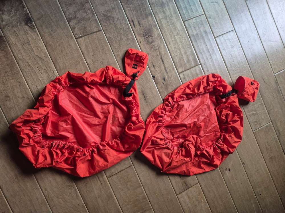 Selling two MEC rain covers in orange! They're in great condition and ready to keep your bags dry. Perfect for biking, hiking or just getting around town on a rainy day.