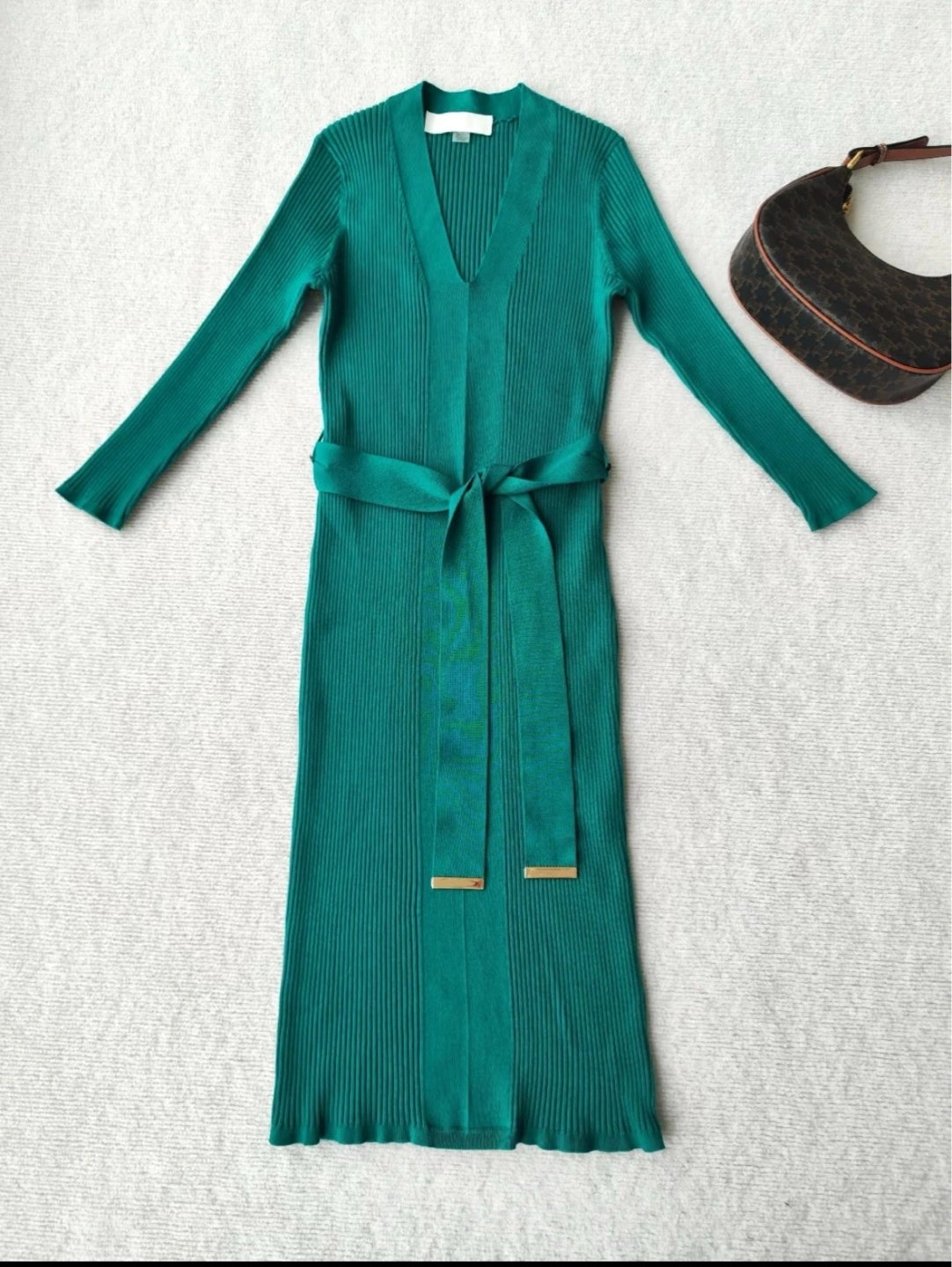 Long sleeve midi dress. V-neckline. Ribbed knit fabric. Self-tie belt. Teal green colour.