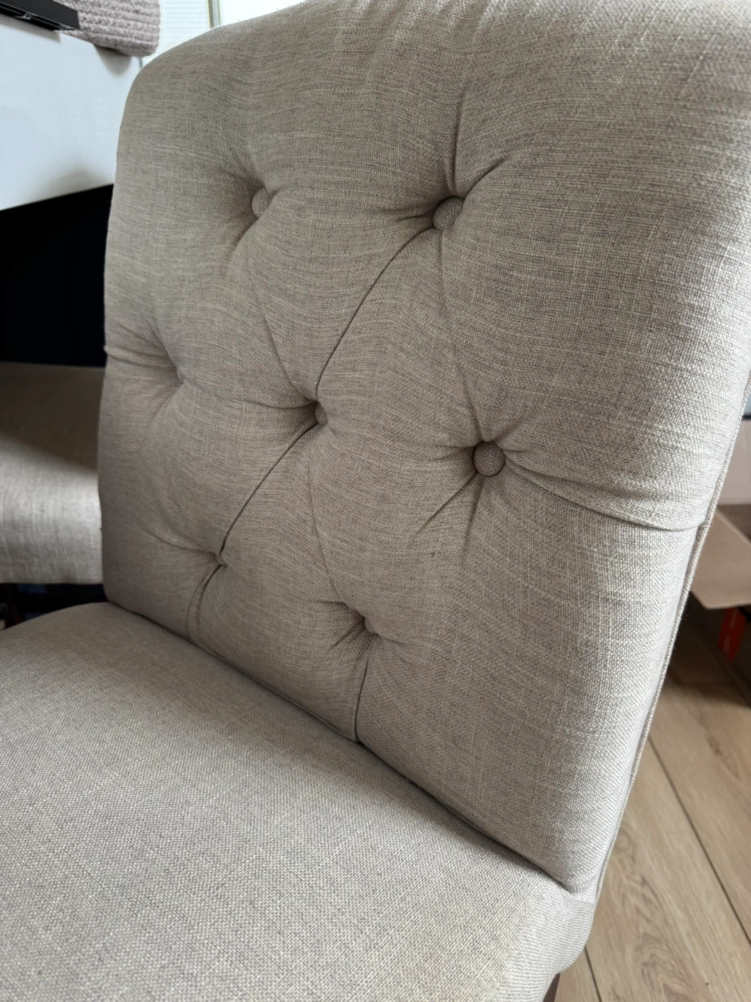 A set of two upholstered bar stools with tufted backs. Linen-look fabric in a neutral beige. Dark wood legs. Includes metal footrest.