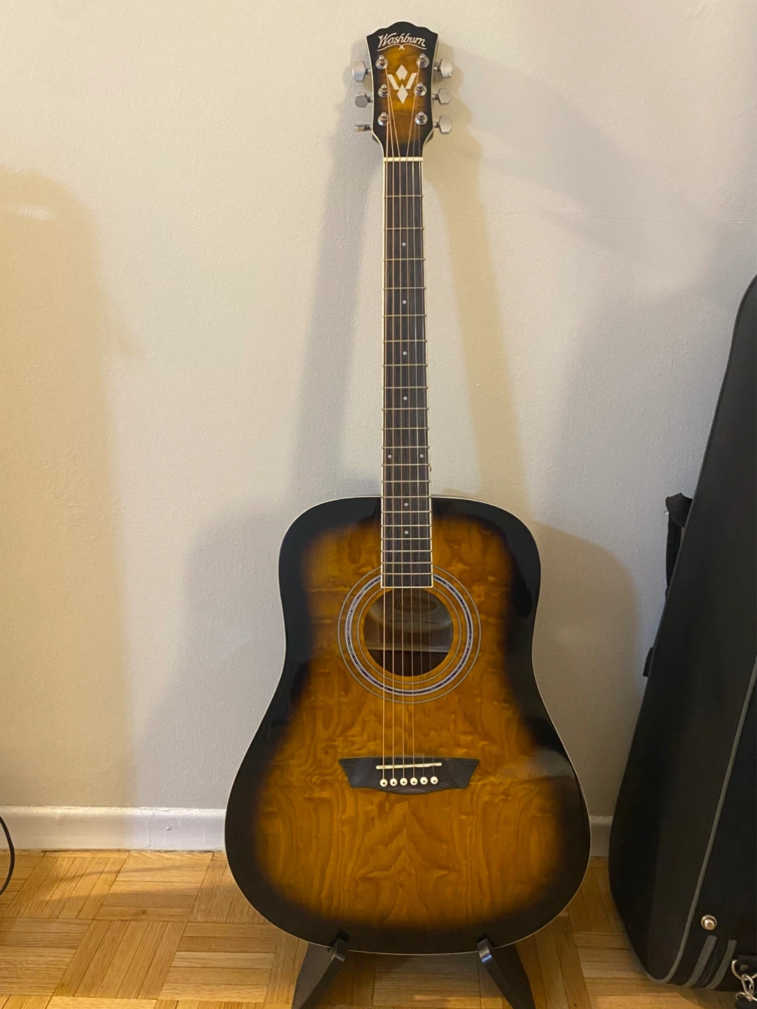 Acoustic guitar with a sunburst finish and a glossy body. Six strings and standard tuning pegs. It's a great instrument for beginners or seasoned players. Ready for strumming!