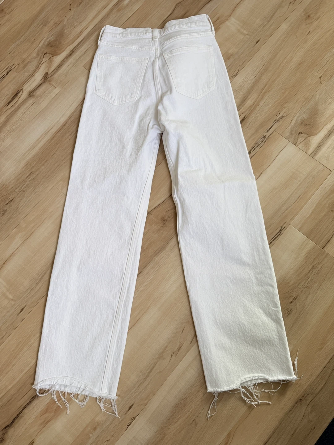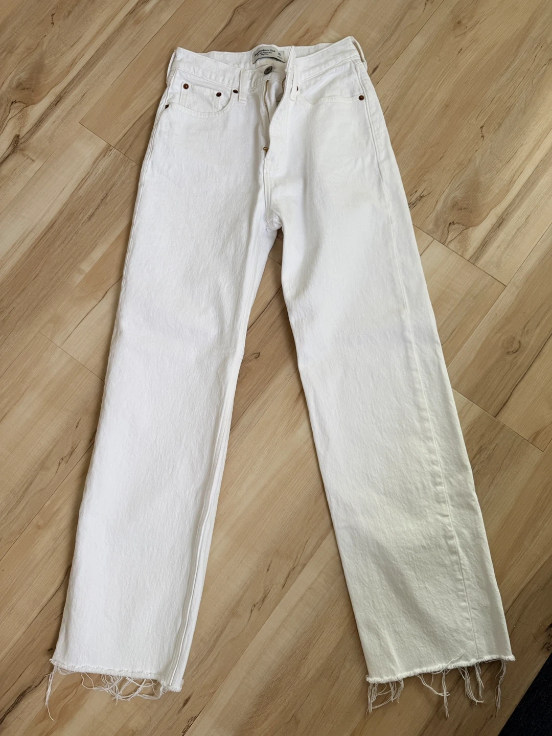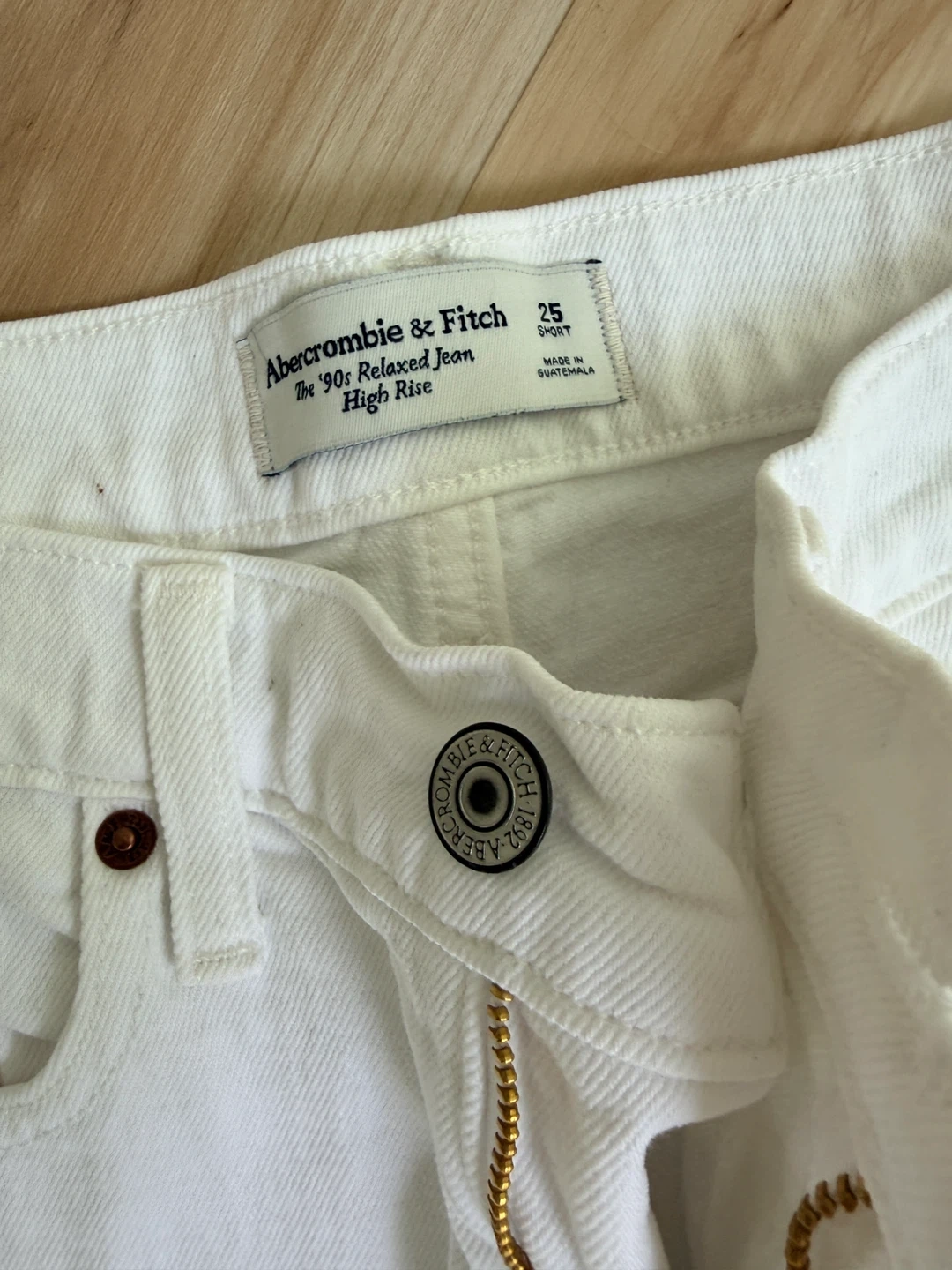 Abercrombie & Fitch white denim jeans. These are the '90s Relaxed Jean style with a high rise. Made in Guatemala. Size 25 Short. Perfect for spring and summer wear!