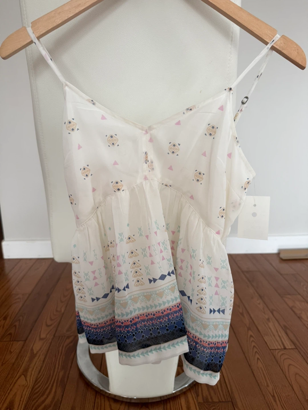 This cute Hollister white tank top features a smocked back and an all-over pug print with a bohemian-inspired patterned hem. It's lightweight and perfect for warm weather! It has adjustable spaghetti straps.