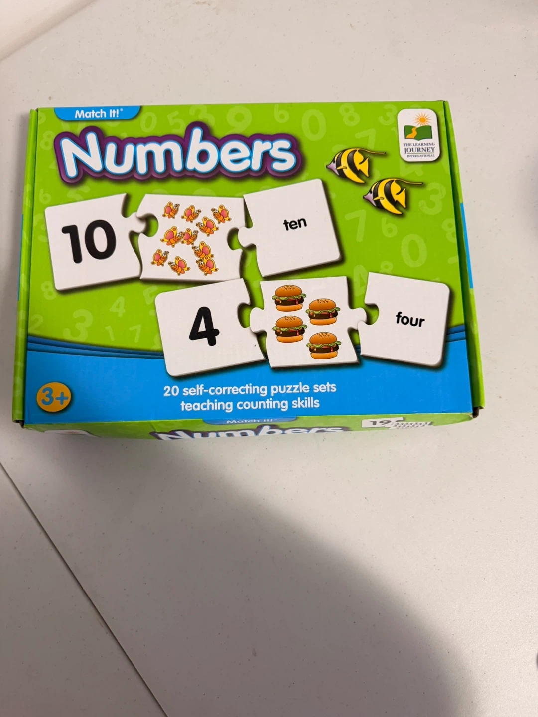 This set includes 20 self-correcting puzzle sets designed to teach counting skills. Each puzzle features numbers and corresponding images for matching. Suitable for children aged 3 years and up.