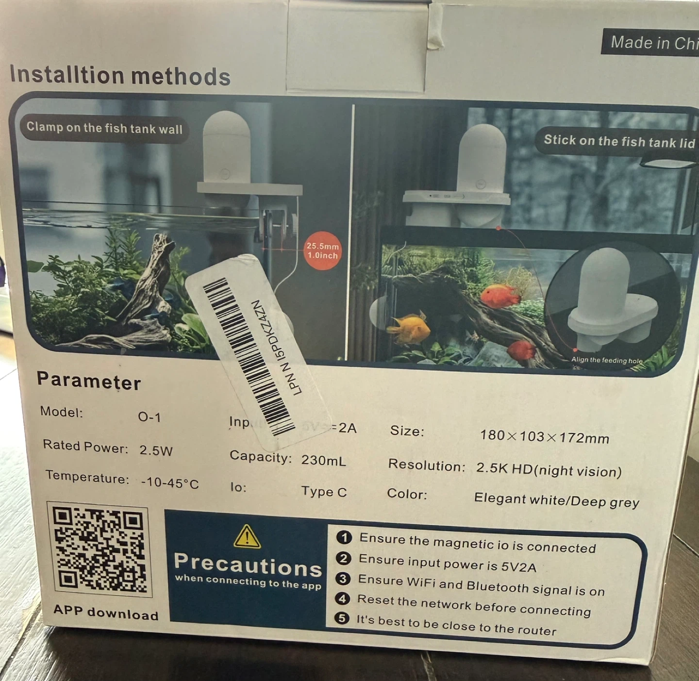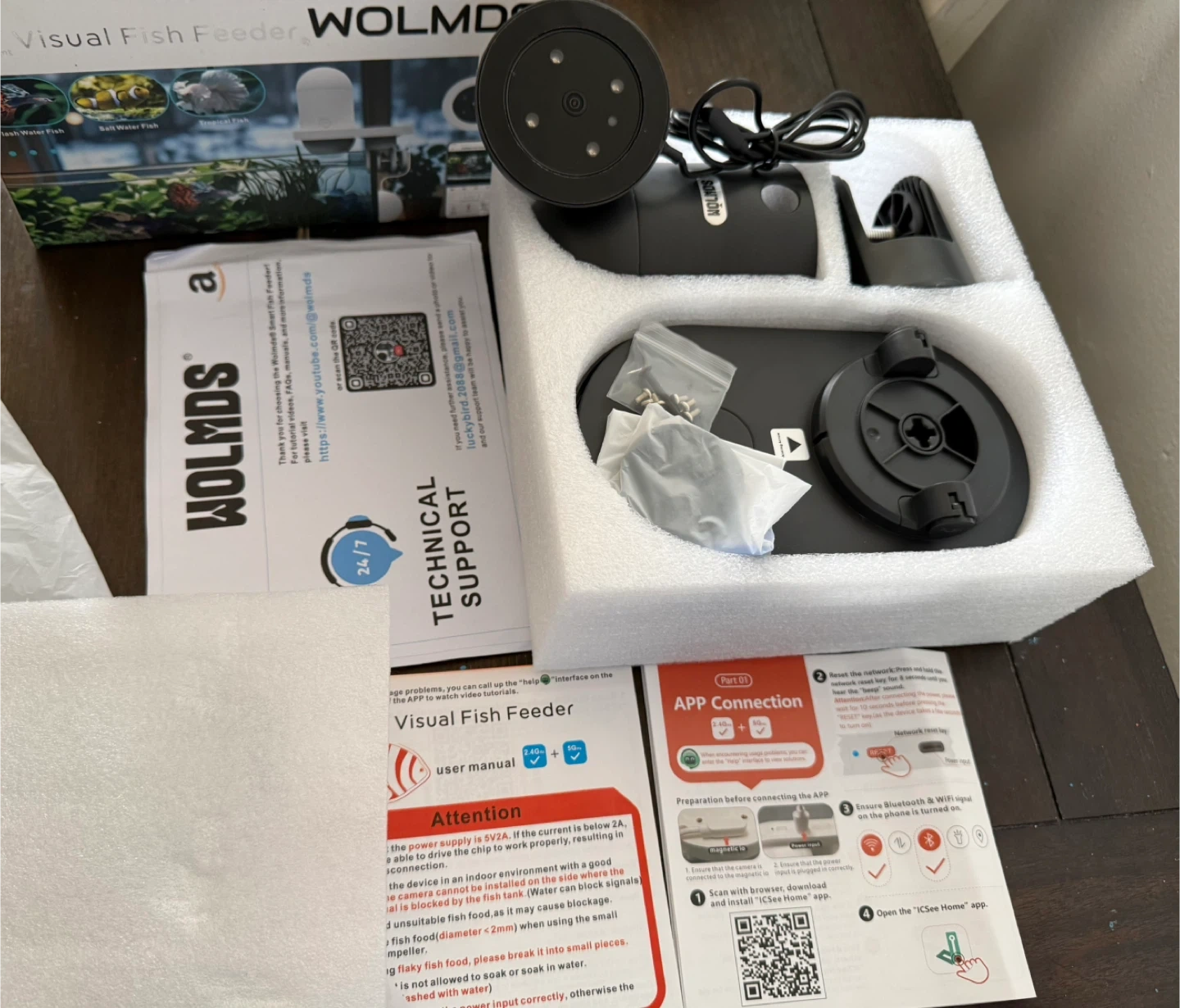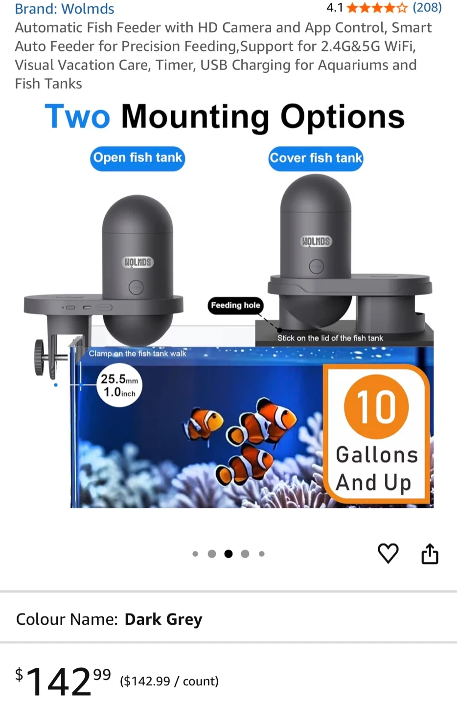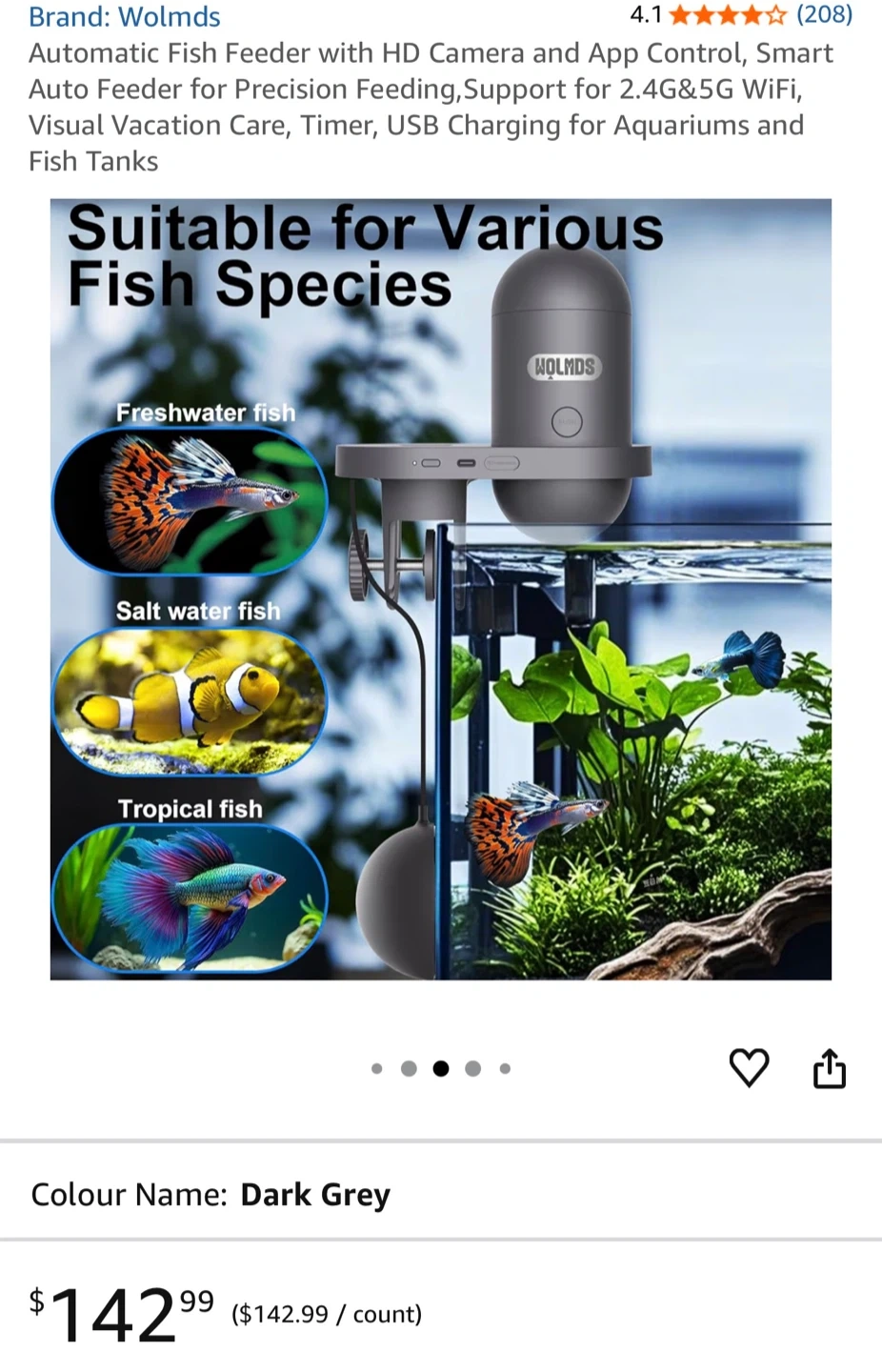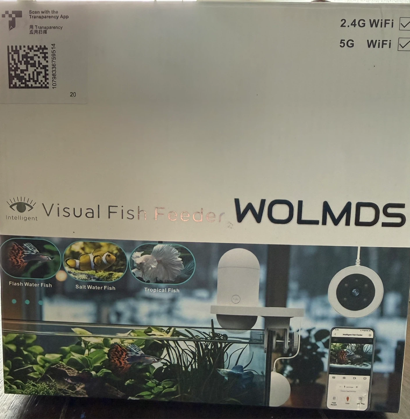 This is a WOLMDS visual fish feeder with an HD camera and app control. It has a 230ml capacity and supports 2.4G & 5G WiFi. It's ideal for vacation care and timers. The unit is designed for both fresh and saltwater fish tanks.