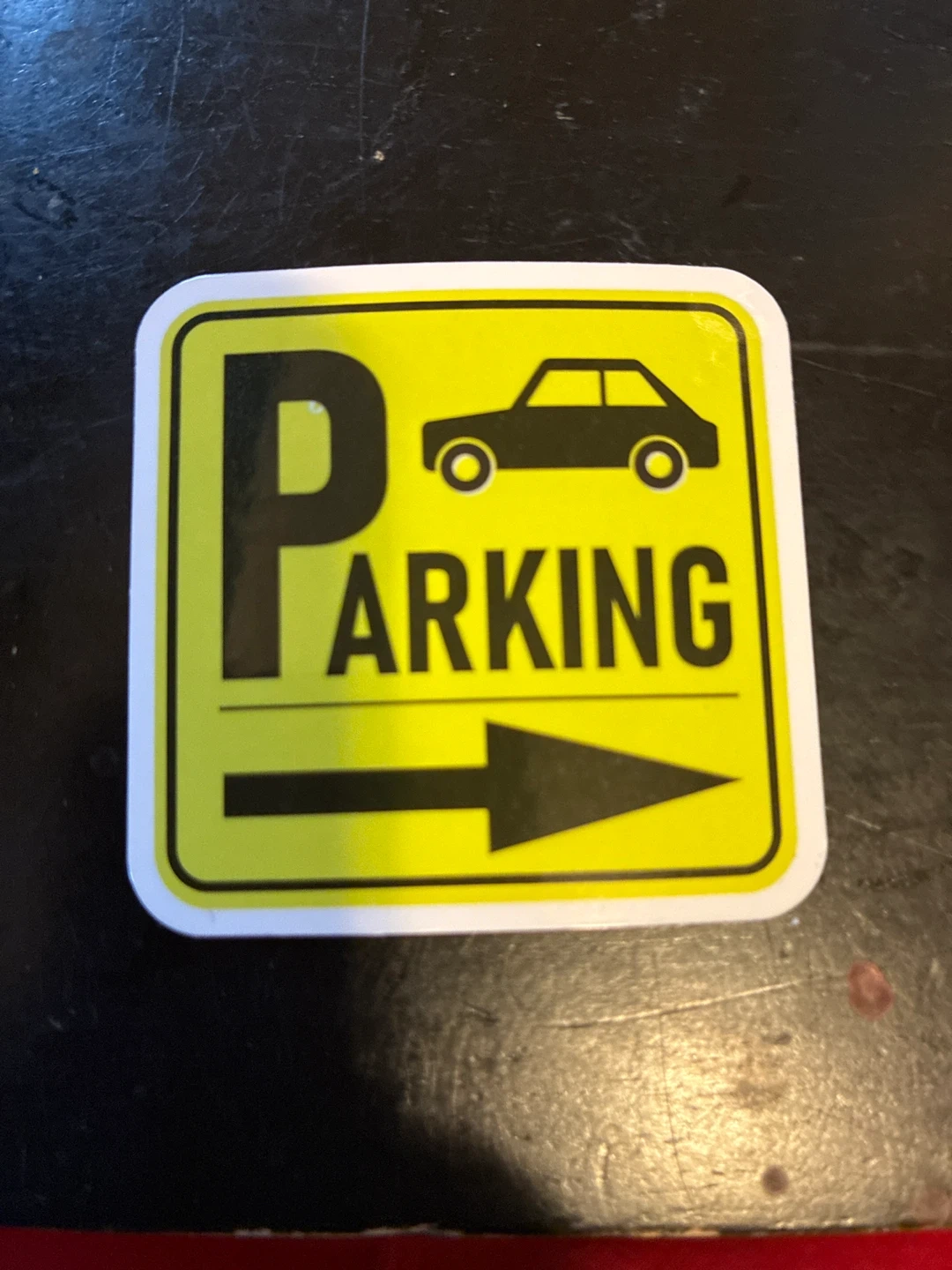 This sticker features a yellow parking sign with a car icon and an arrow pointing to the right. It's a fun decal for laptops, water bottles, or anywhere you need a little parking humor!