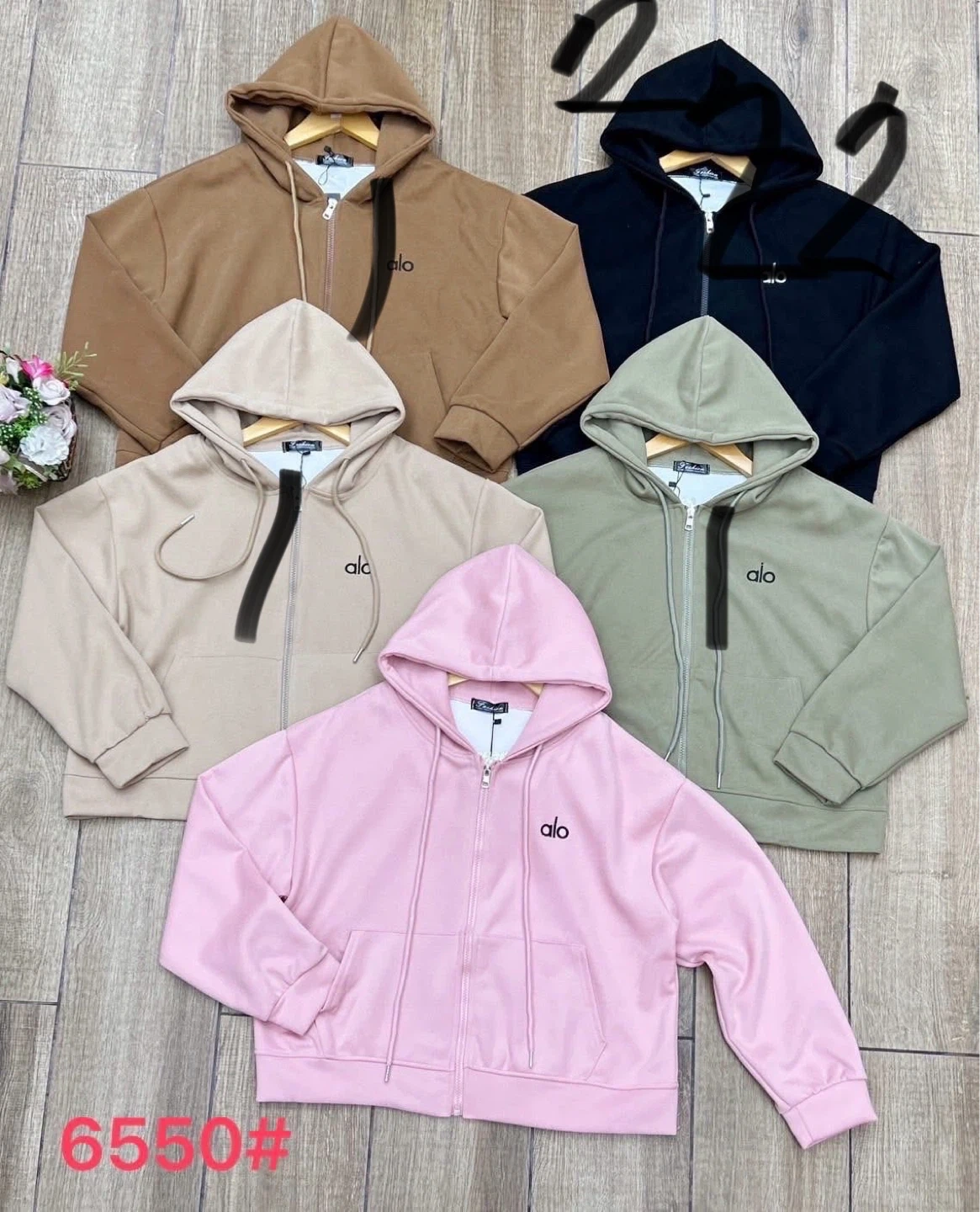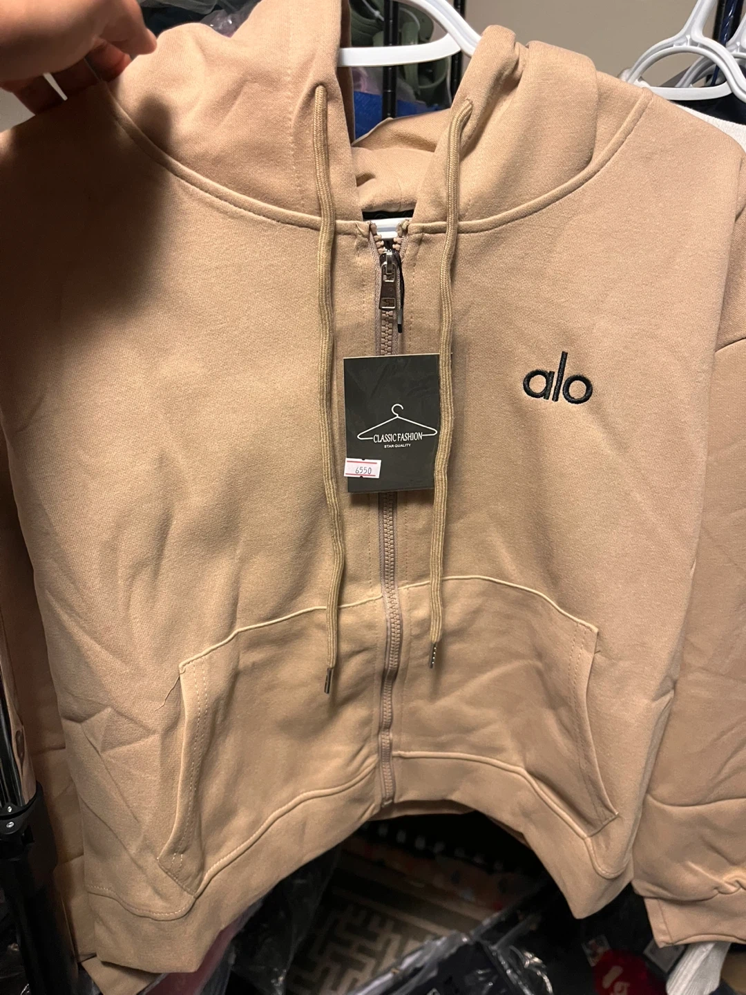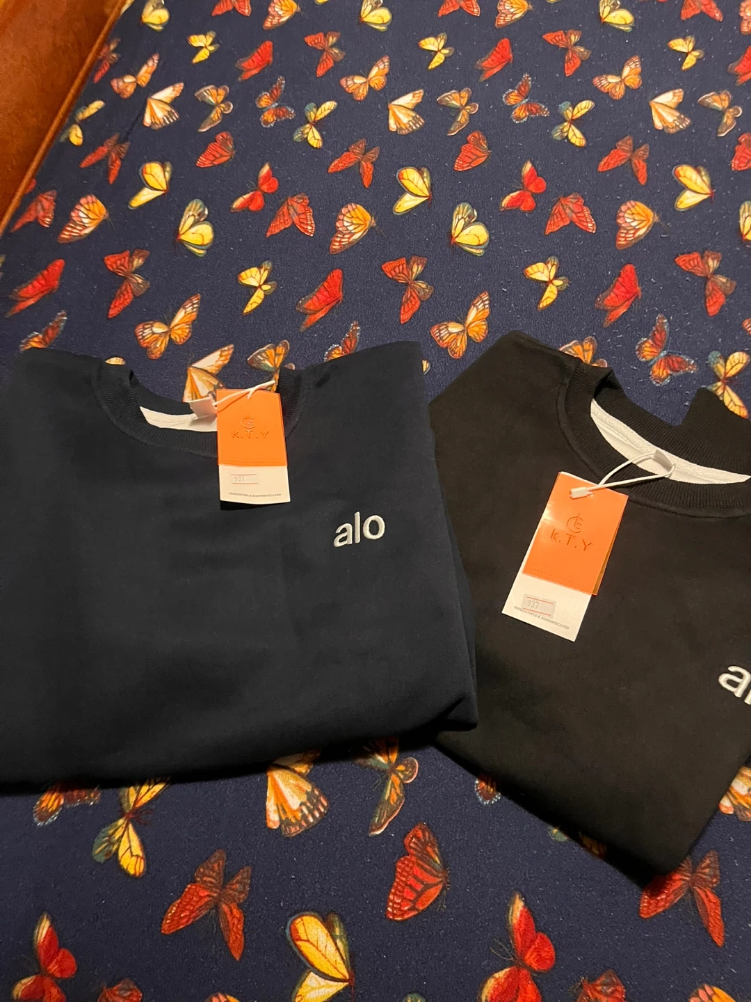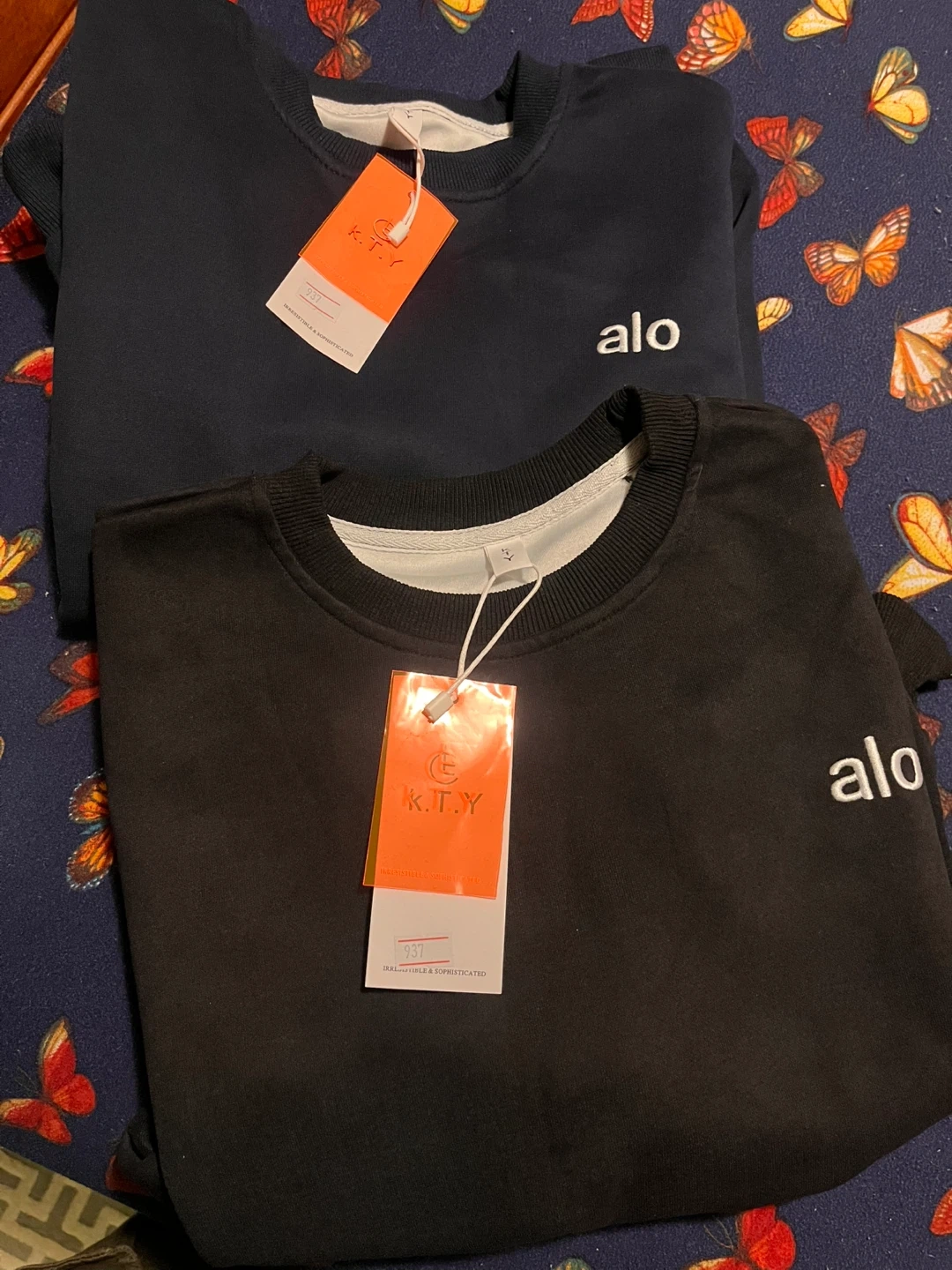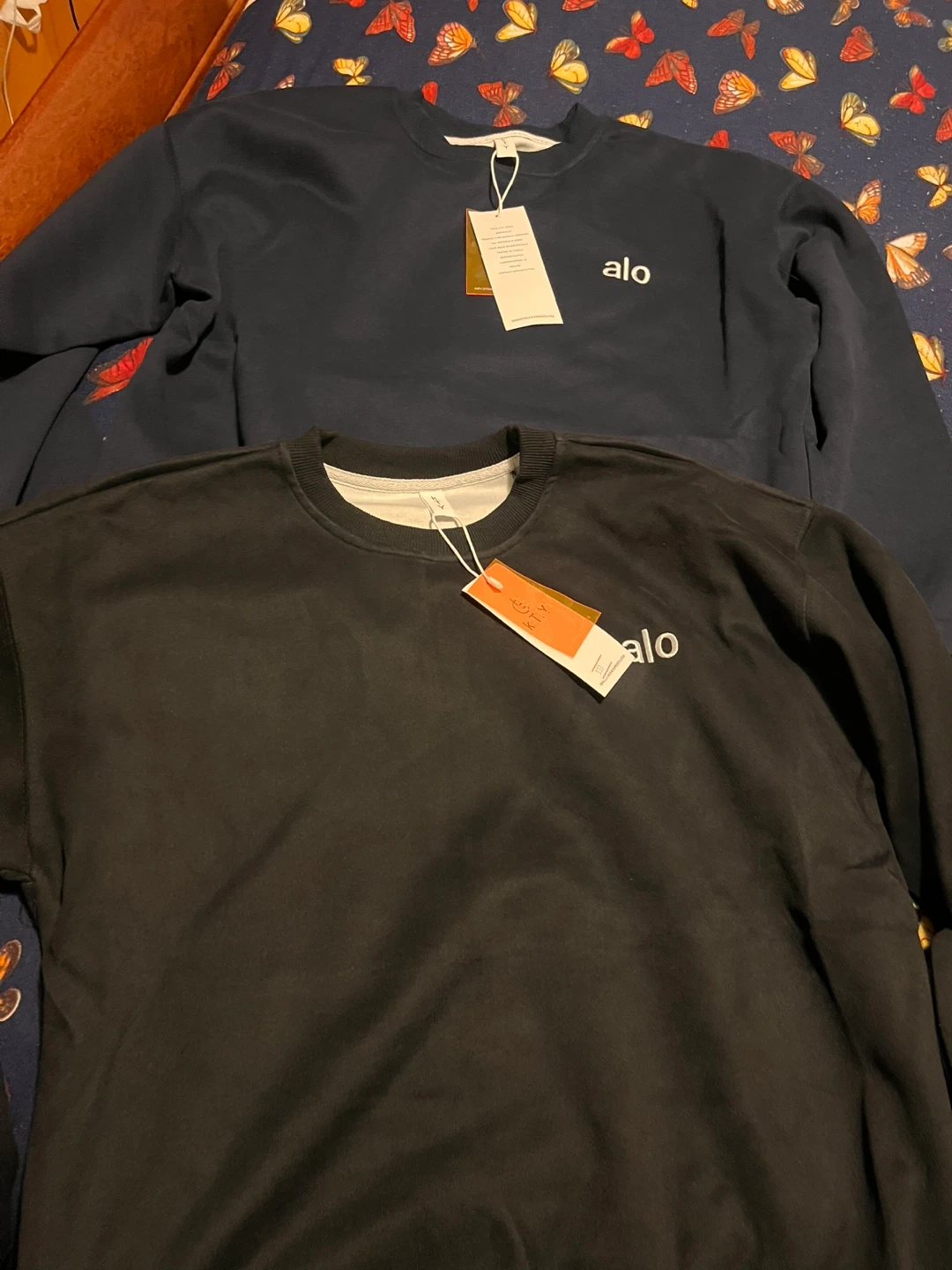 Bundle of two sweater crewneck sweatshirts in navy and black, and one beige zip-up hoodie. All items appear to be new with tags. Made from soft, comfortable material with Alo Logo. 50 each