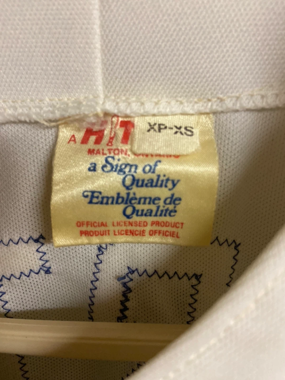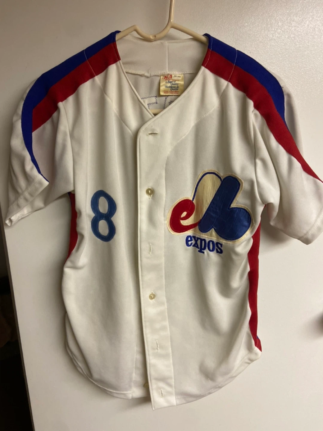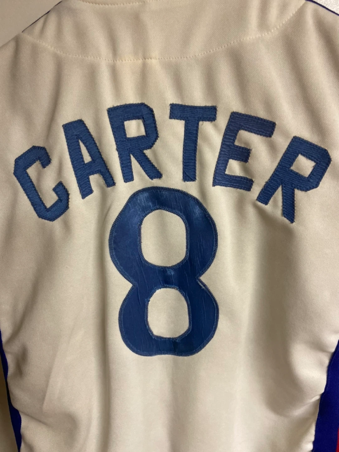 This is a Montreal Expos baseball jersey with "Carter 8" on the back. It's an officially licensed product. Made by HT Malton, size XP-XS.
