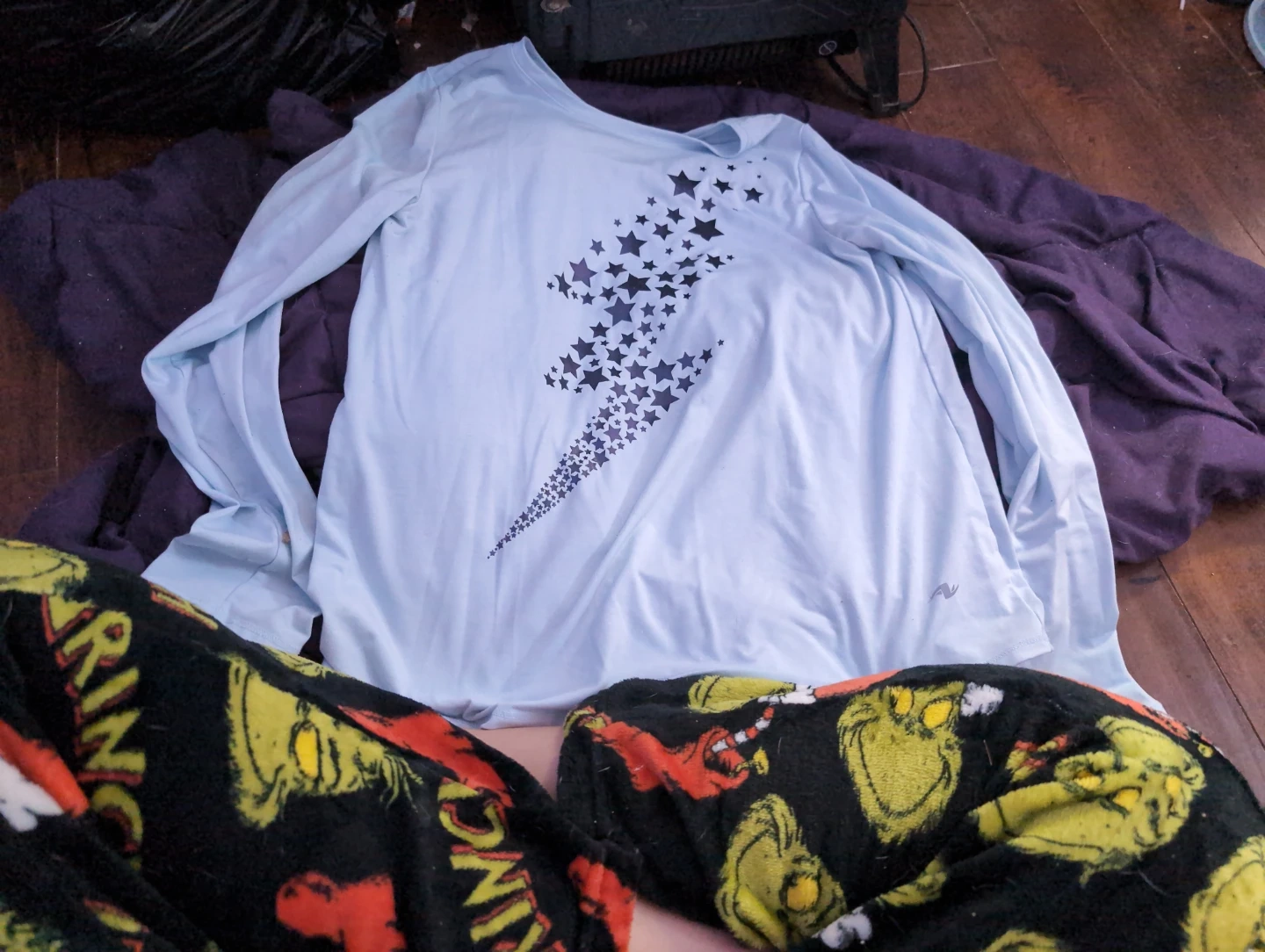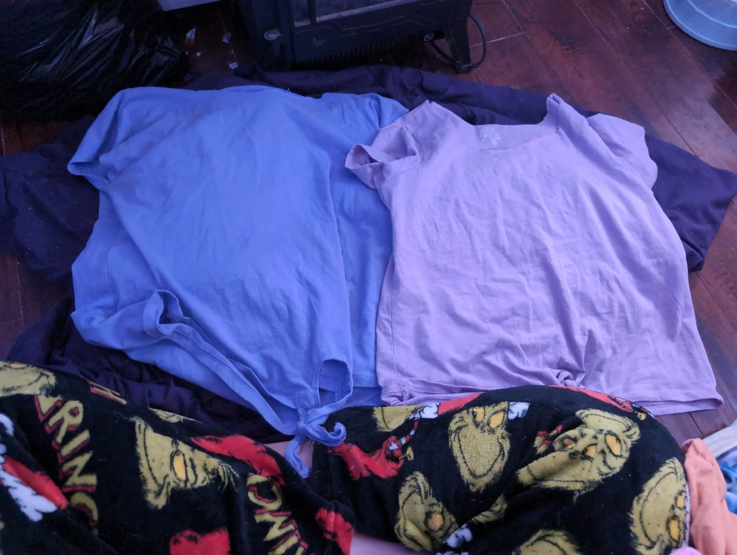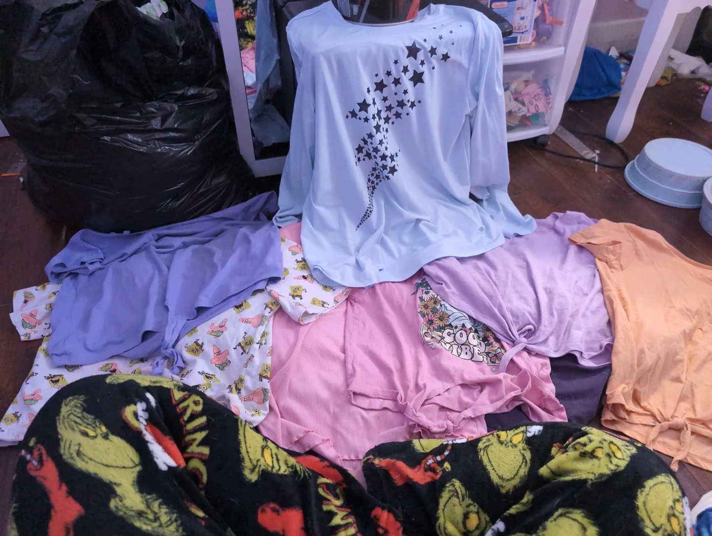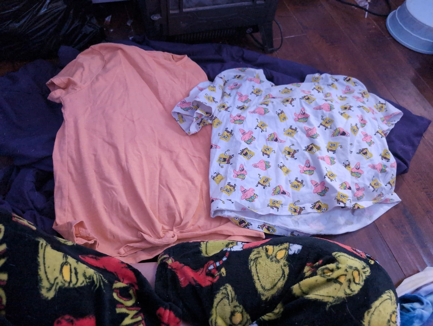 This bundle includes five t-shirts in various colours and designs. One shirt has a lightning bolt with stars graphic, and another features Spongebob Squarepants. The rest are solid coloured. Shirt materials vary but appear to be soft and comfortable for everyday wear.
