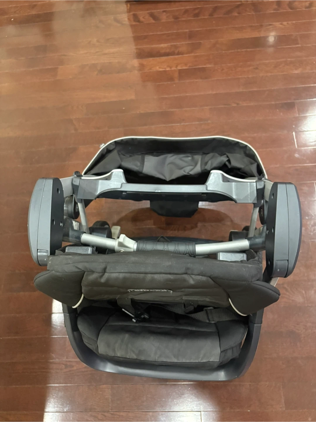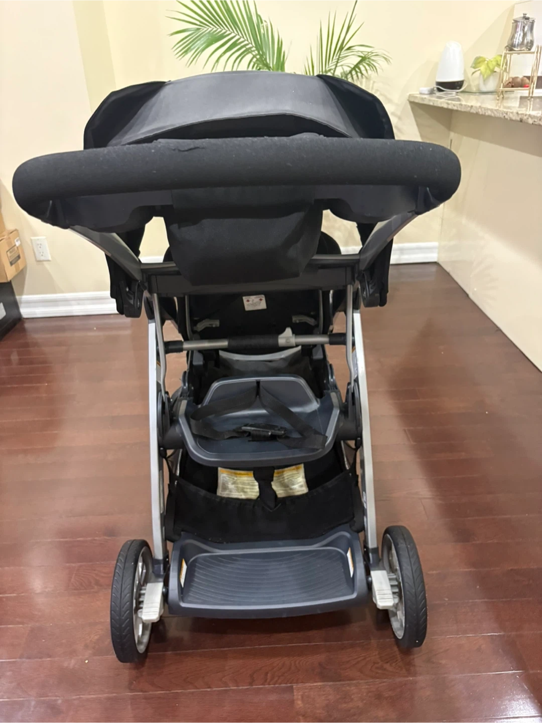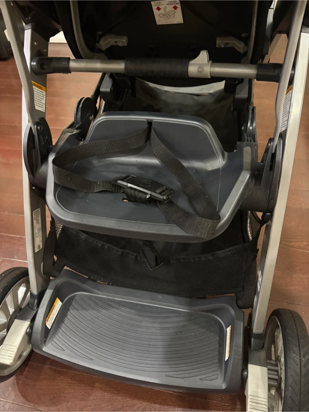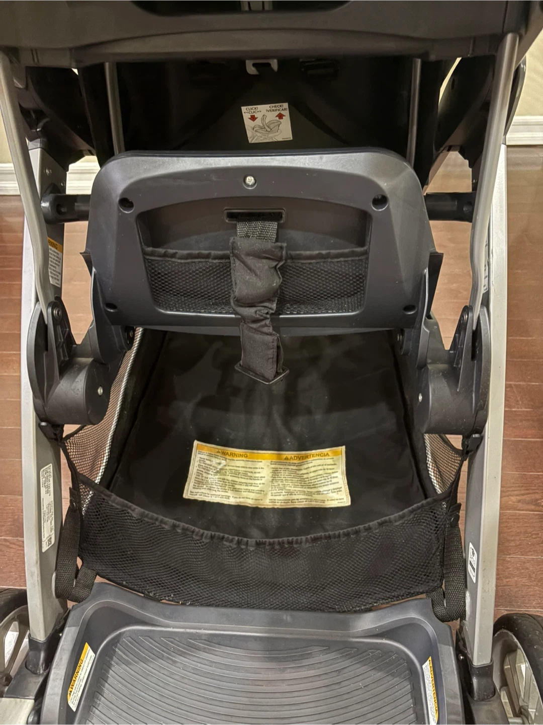 Black Chicco Bravo stroller. Features a child tray with cup holders and a large storage basket. It's great for outings with your little one!