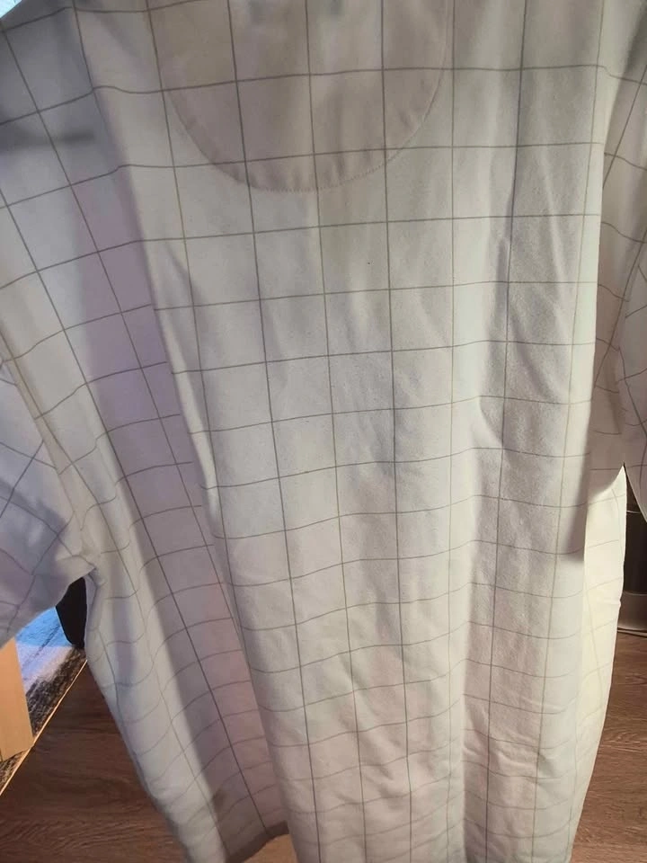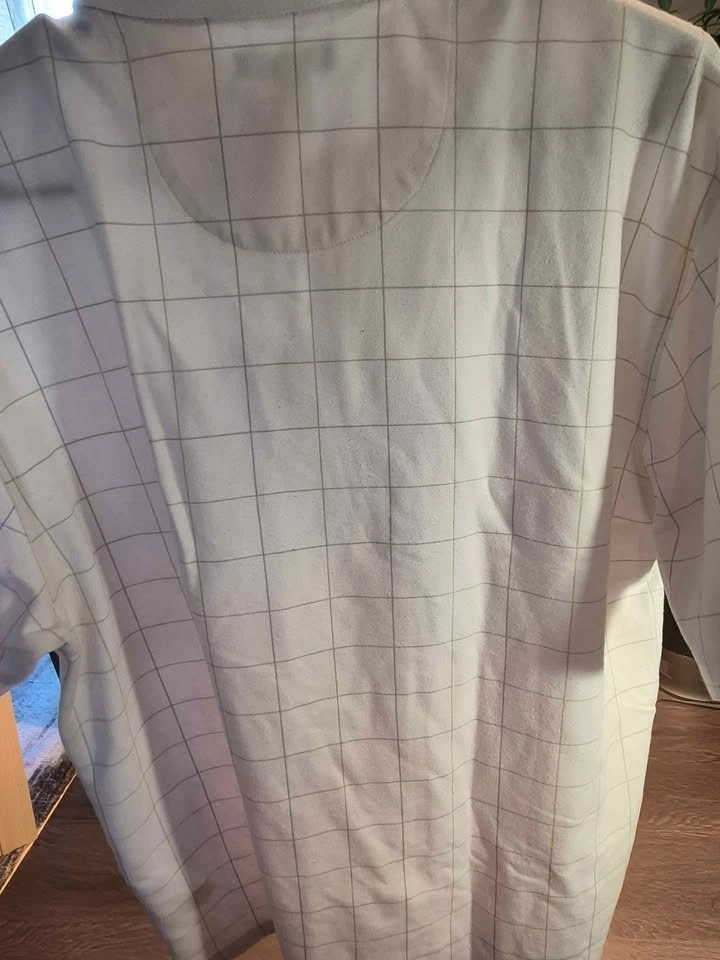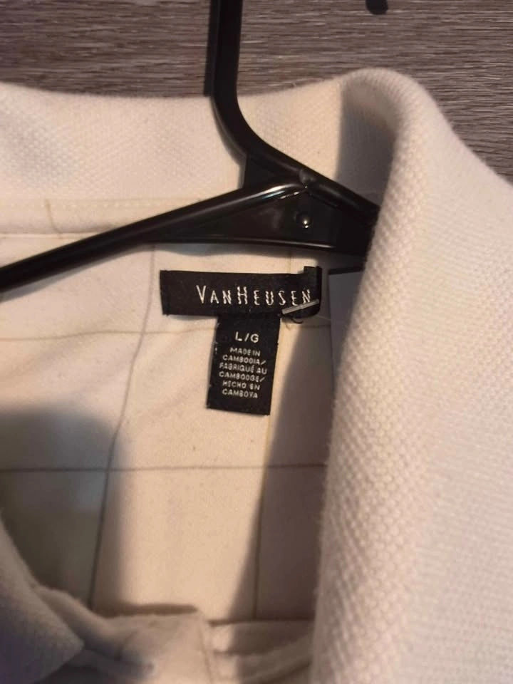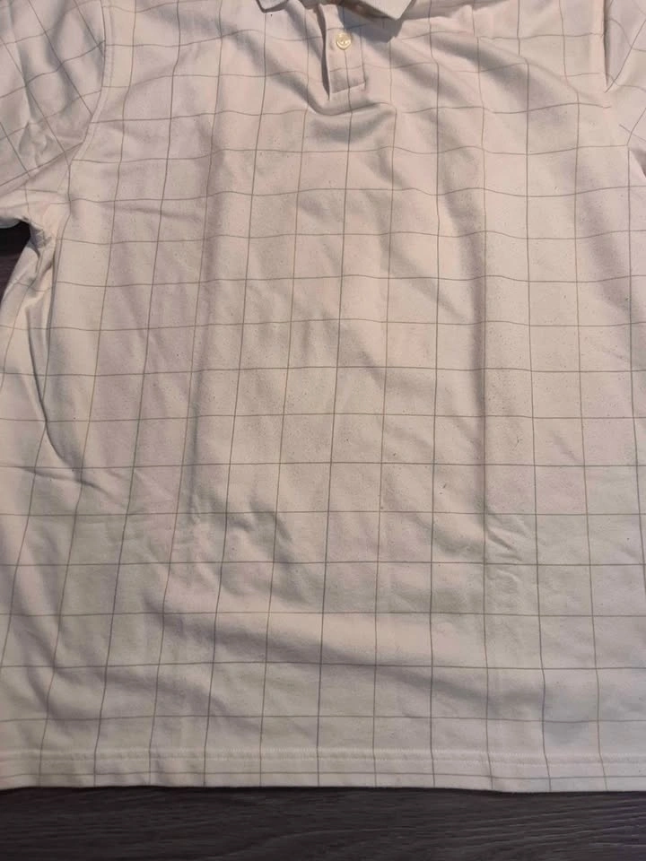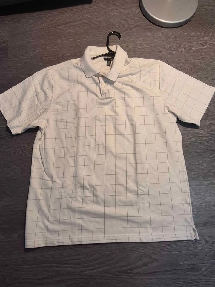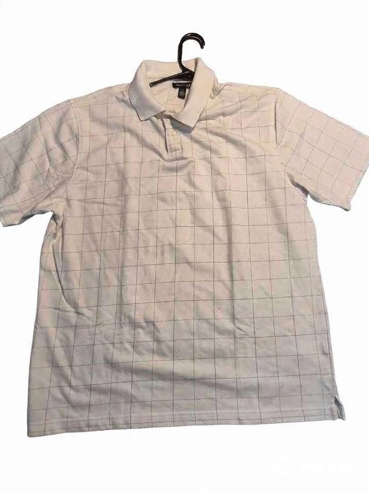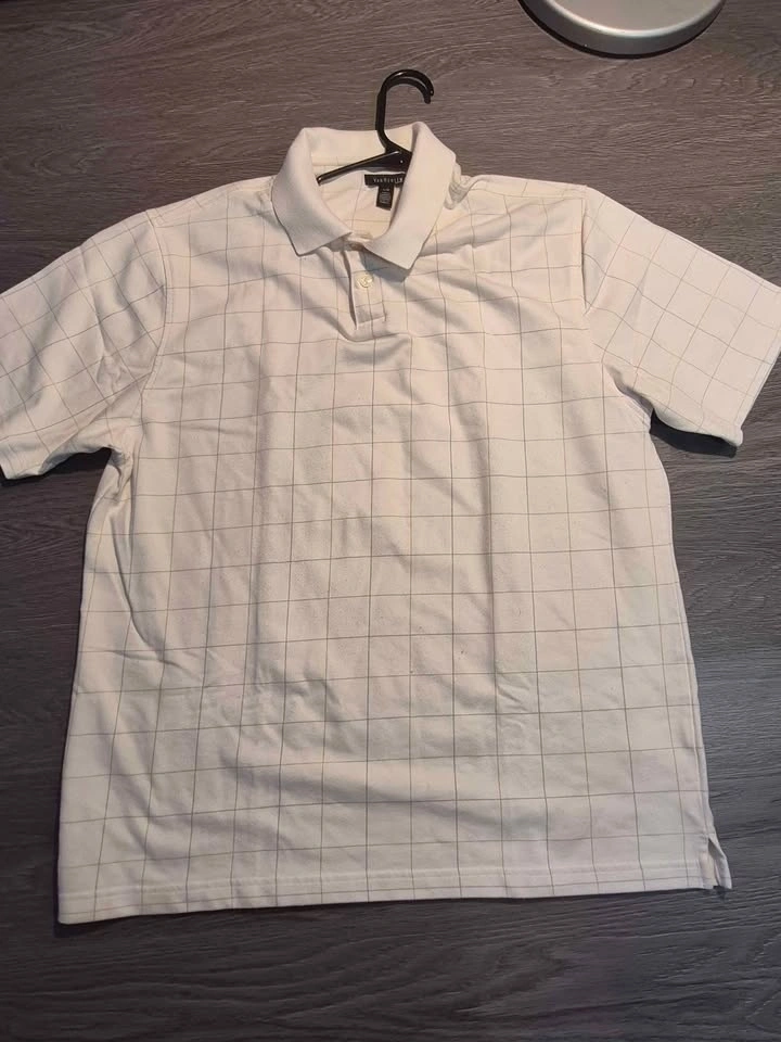 Brand: Van Heusen. Color: White with subtle grid/windowpane pattern. Style: Classic polo, short sleeve, 2-button placket.
