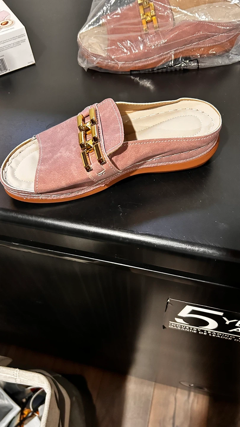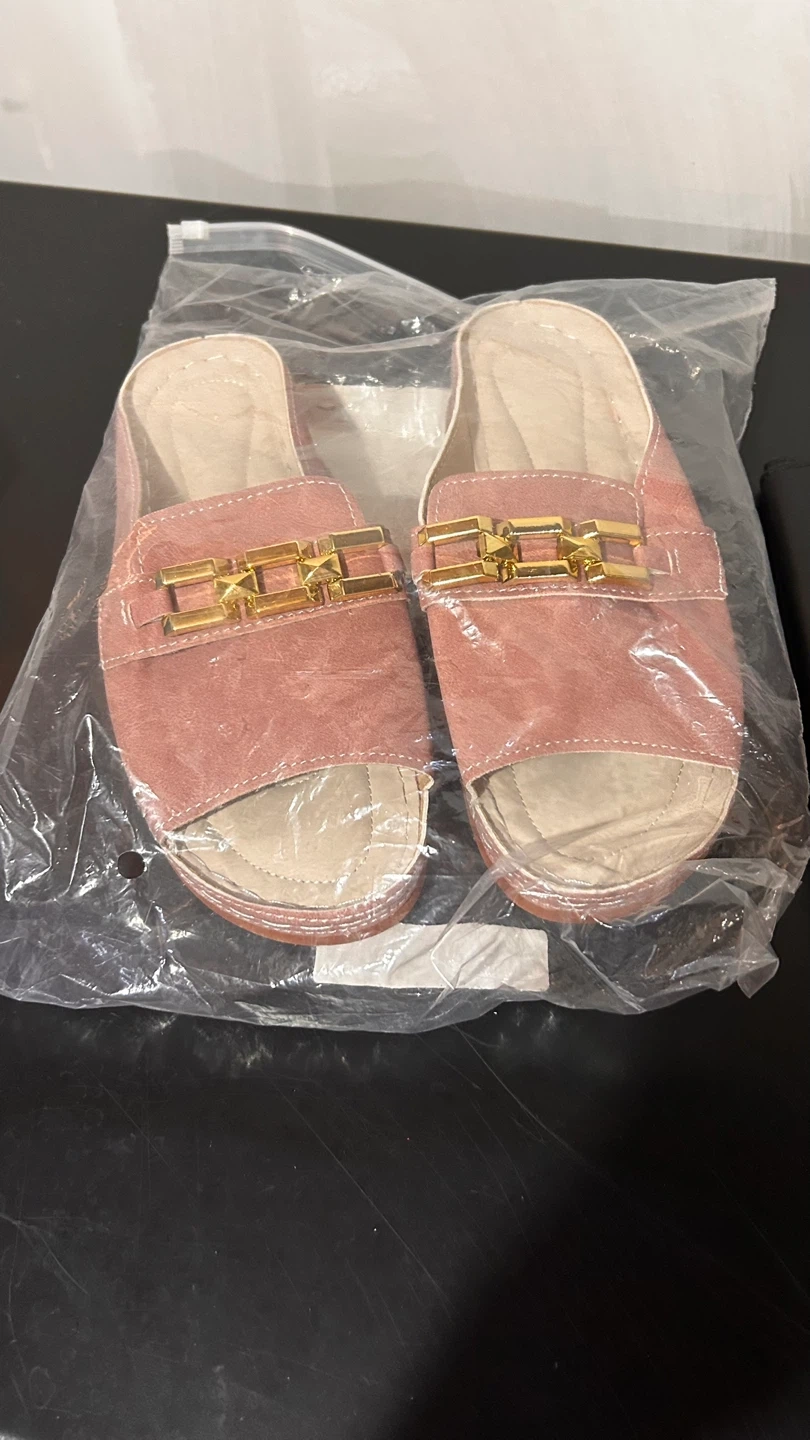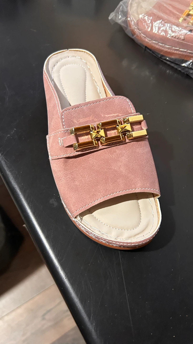 These slip-on slides are a stylish pink colour with a decorative gold chain across the vamp. They feature a comfortable cushioned insole and a durable sole. Easy to slide on for casual outings!