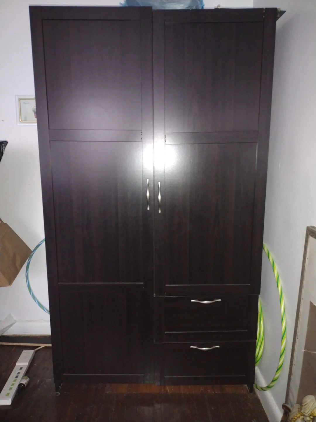 Dark wood wardrobe with double doors and two drawers. It includes a hanging rod and shelving inside. Ample storage for clothes or other items!