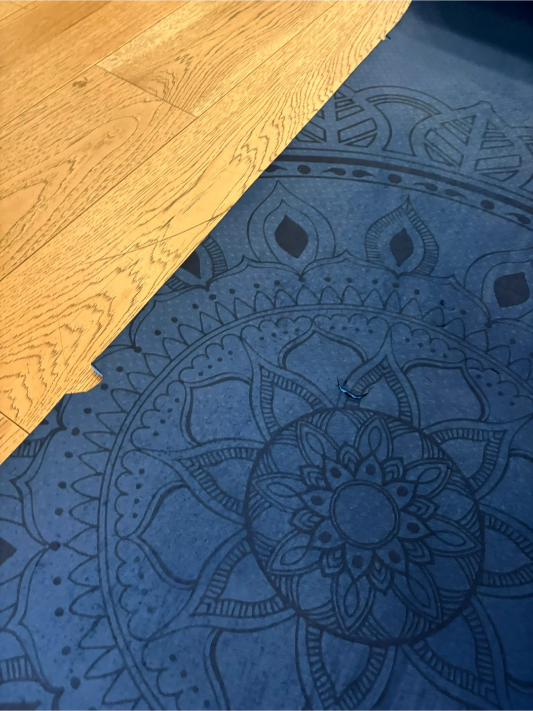 A blue yoga mat featuring an intricate mandala design. It's made of a durable material for good grip during your practice. This mat is suitable for yoga, stretching, or general fitness exercises. Minor damaged but still has lots of life left.