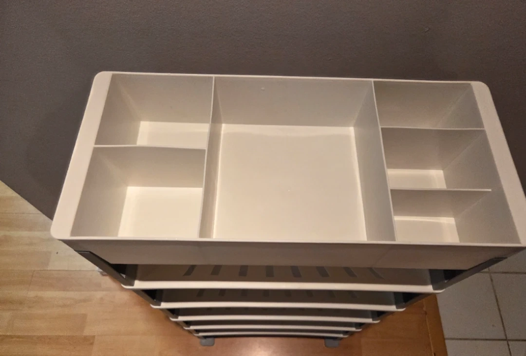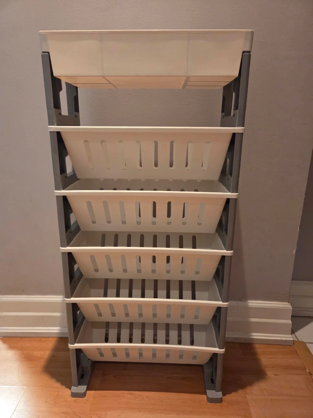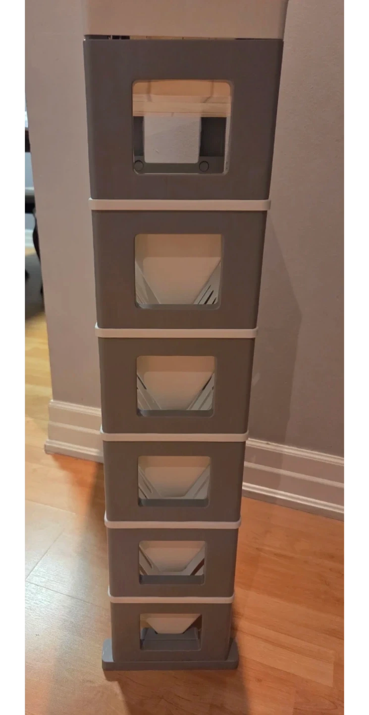 This is a white and grey plastic storage tower with six slide-out bins. It's great for organizing small items in a bathroom, craft room, or entryway. The bins have slotted sides for ventilation.