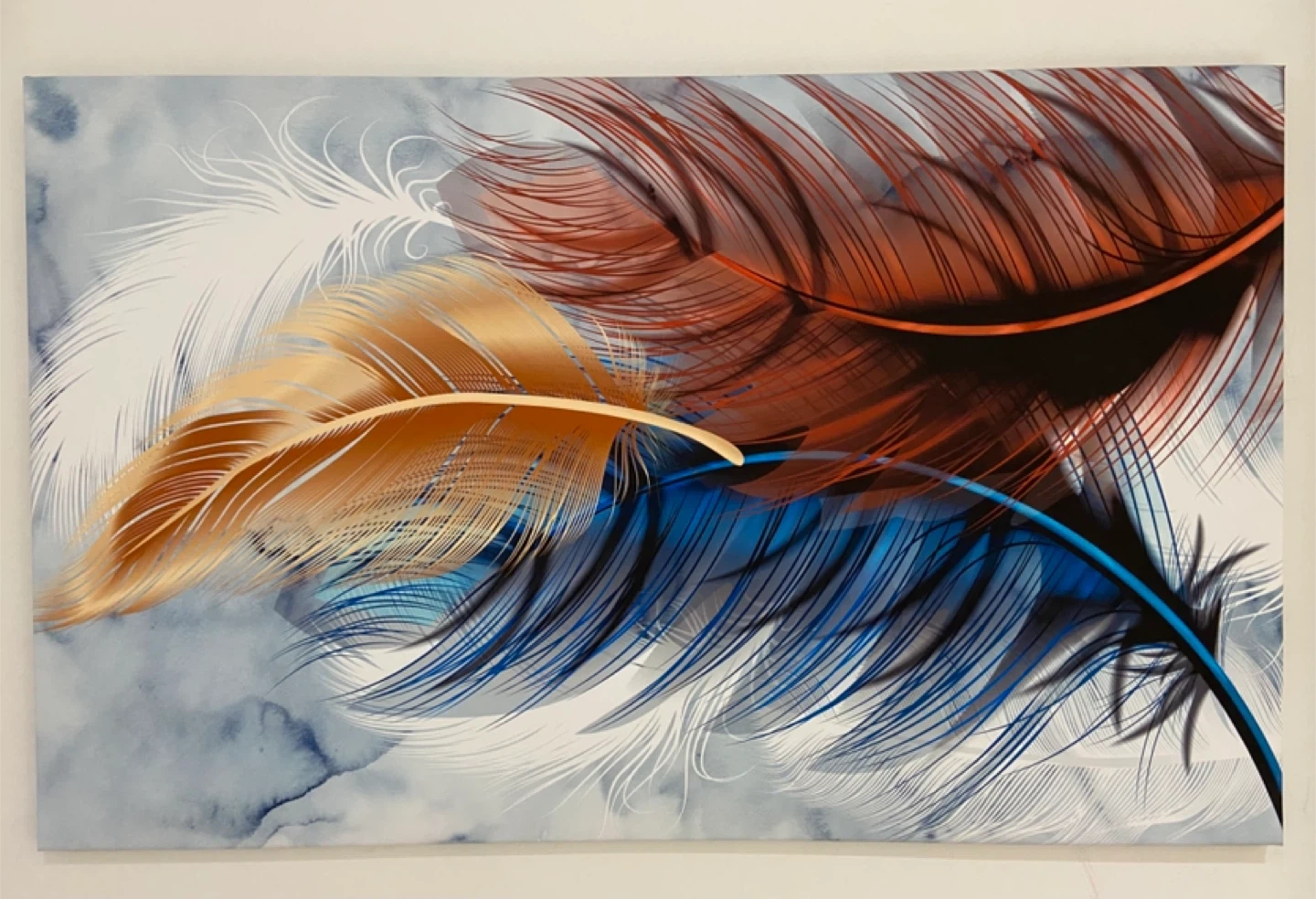 This canvas print features a beautiful arrangement of colourful feathers. It's a vibrant piece that adds a touch of nature's artistry to any room.
