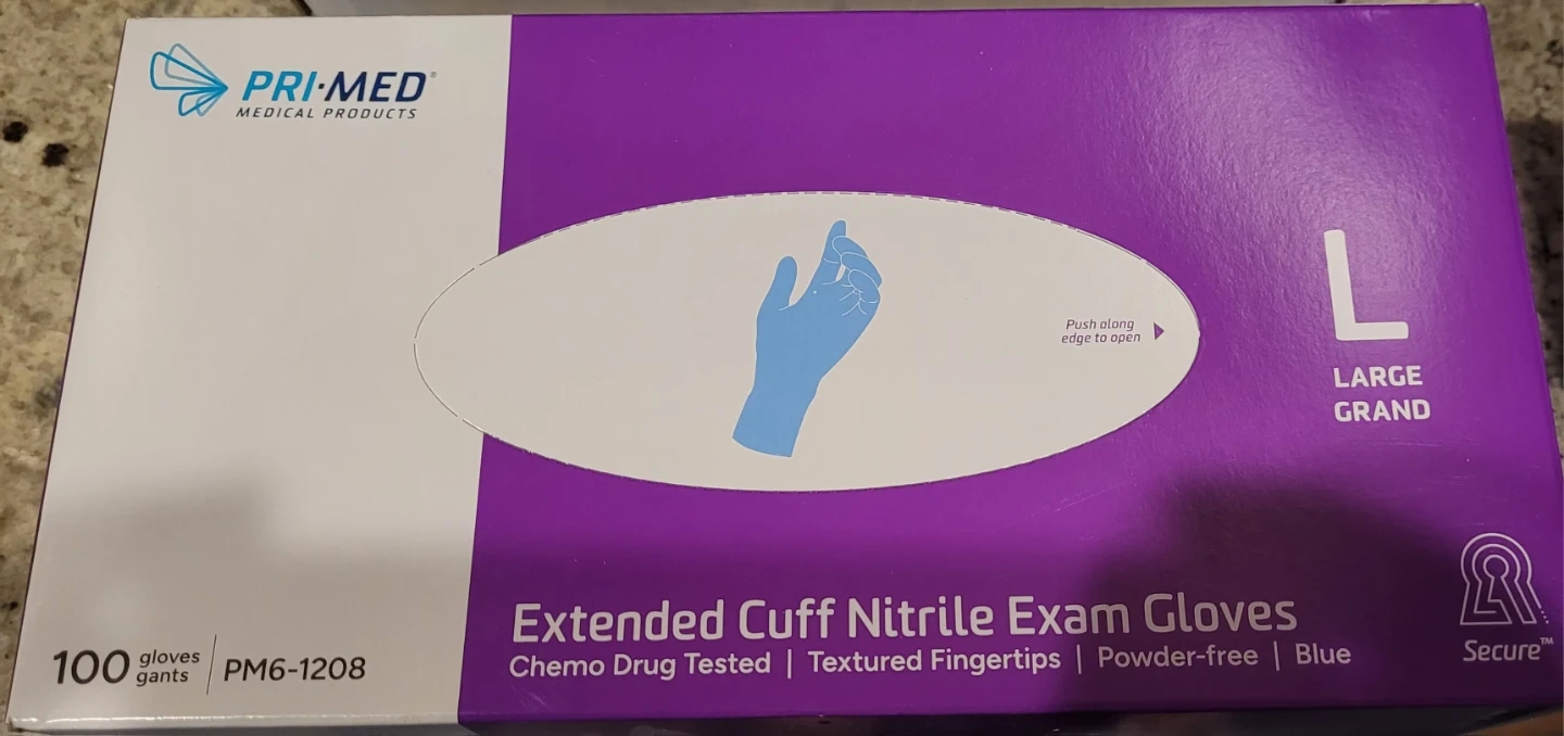 PRI-MED Extended Cuff Nitrile Exam Gloves come in a box of 100. They're blue, powder-free, and chemo drug tested. Textured fingertips provide a good grip. These are a size Large.