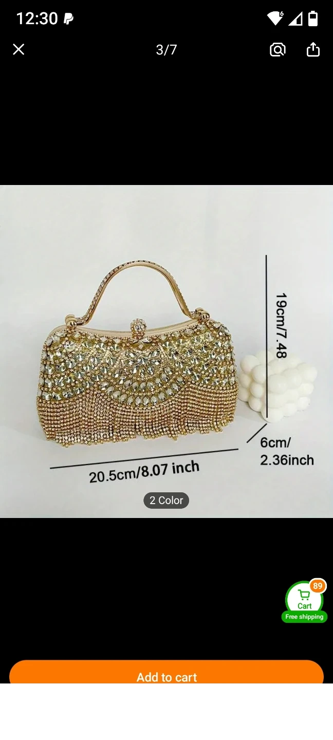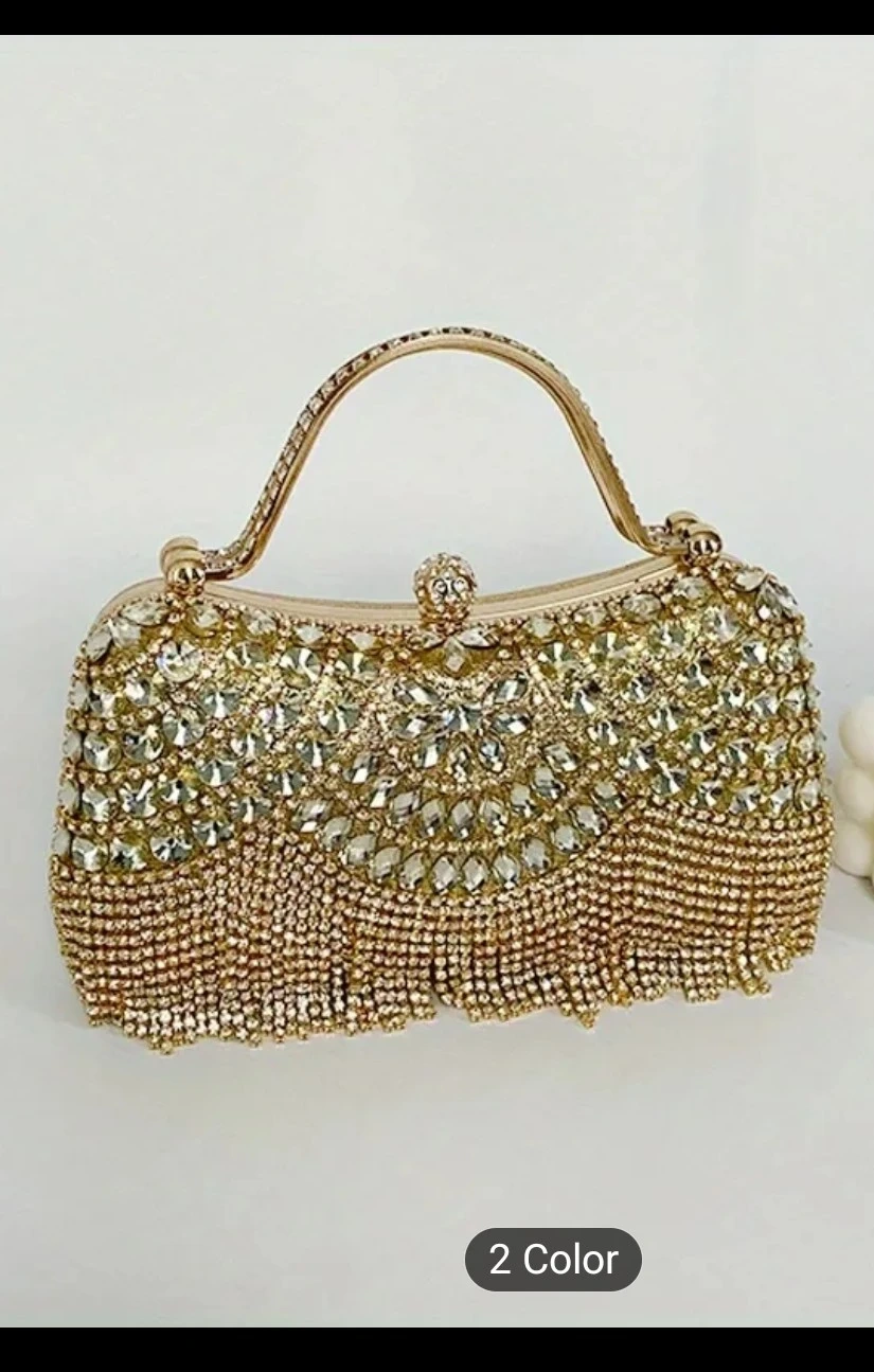 This clutch handbag is adorned with sparkling rhinestones and delicate fringe detailing. Dimensions: 20.5cm x 6cm x 19cm. It's a stunning accessory for evening events or special occasions! It is truly gorgeous in person. Elegant and Glamorous