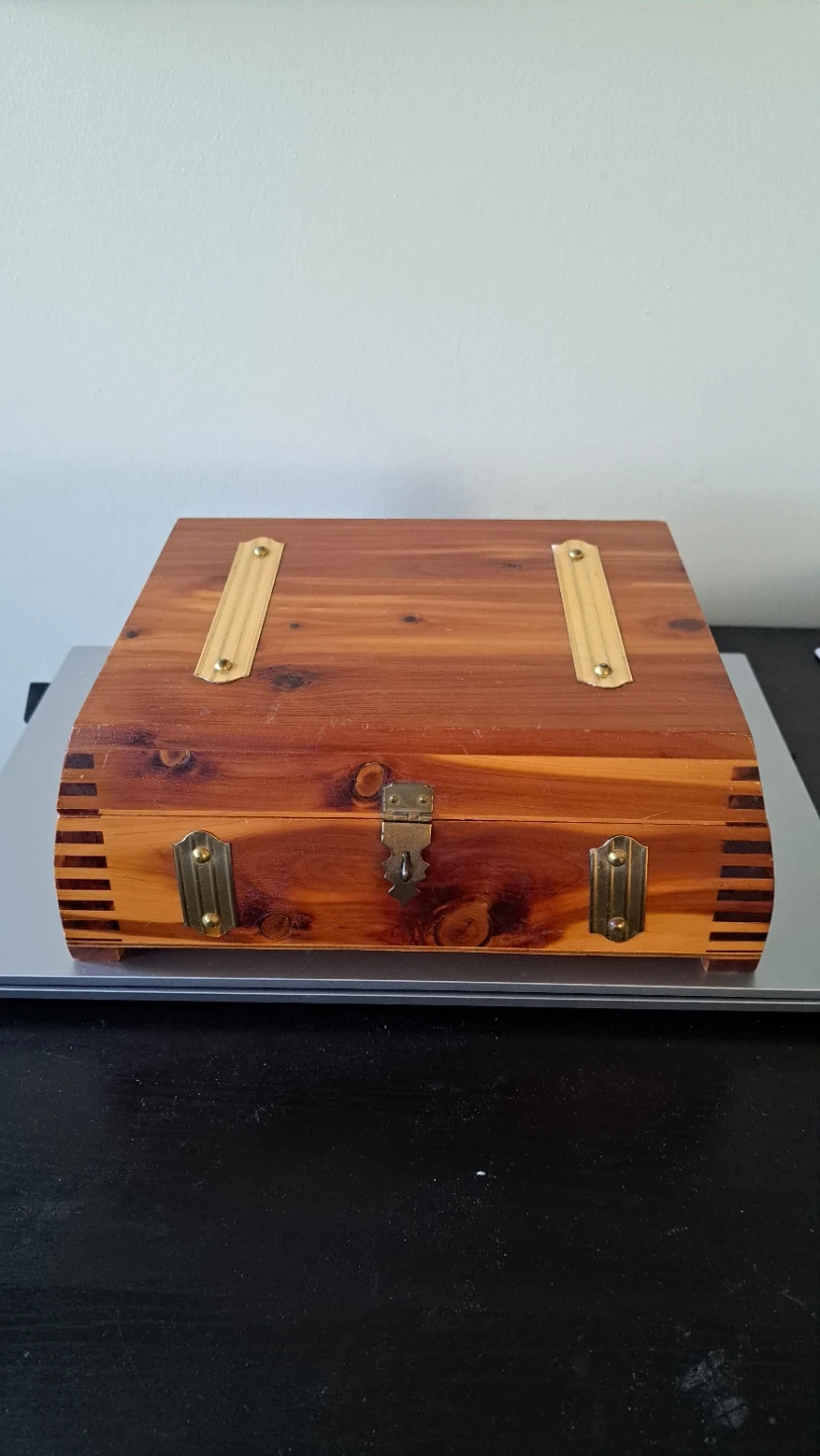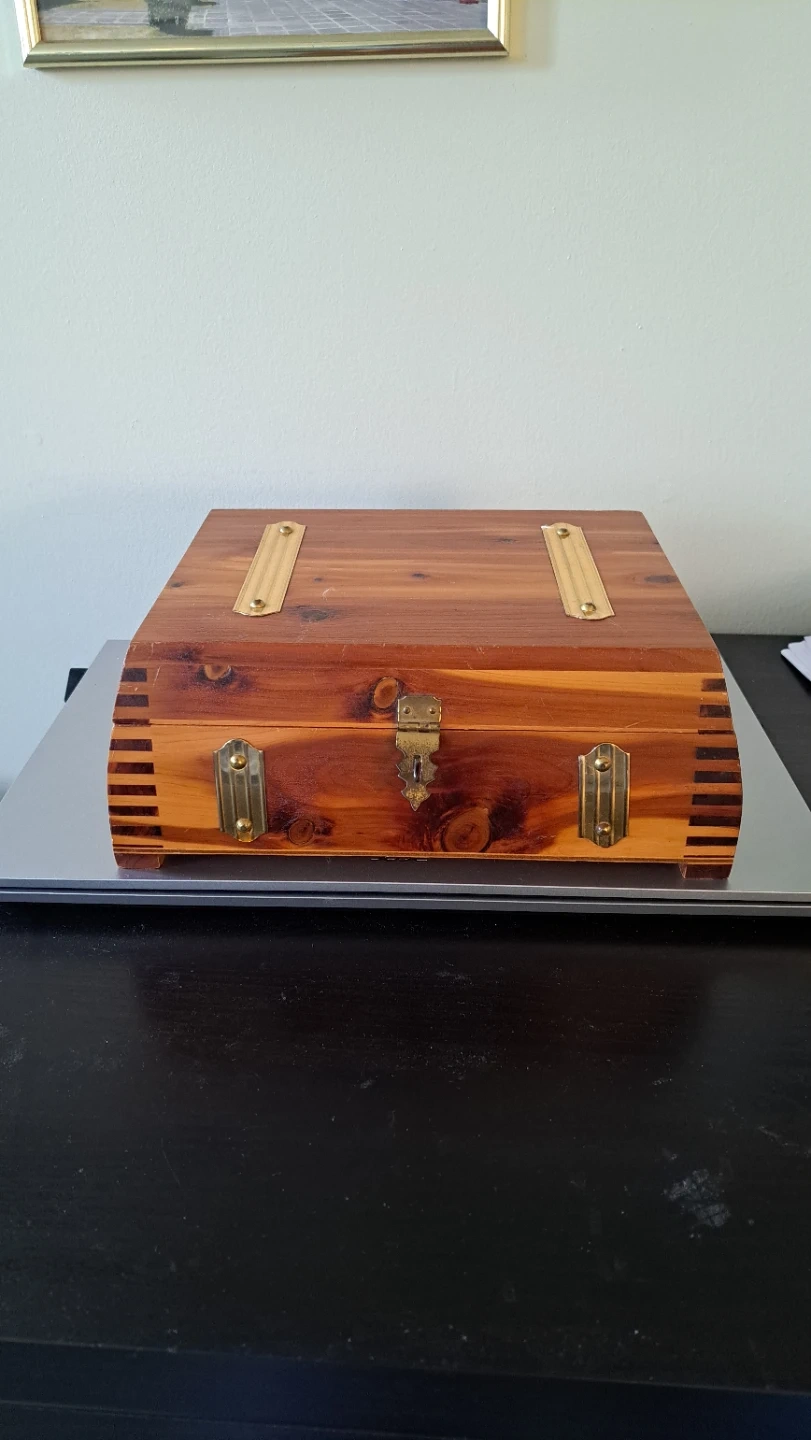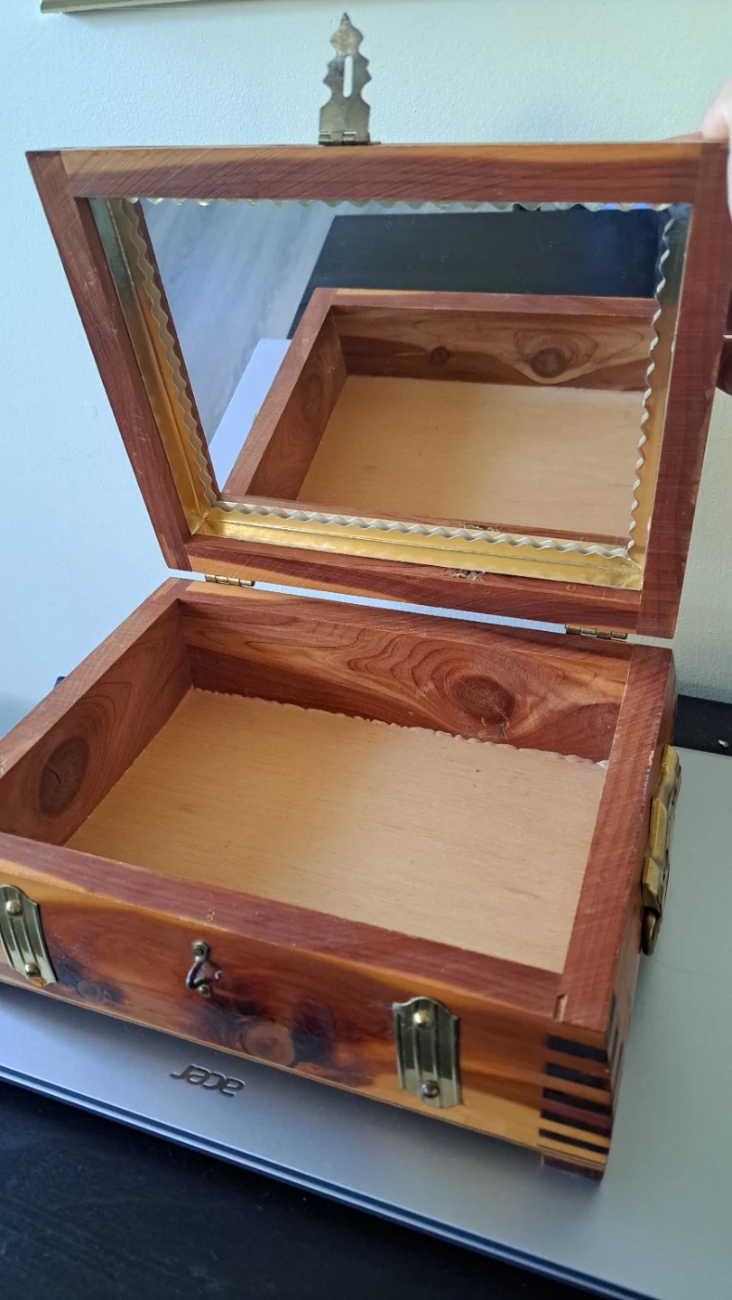 This cedar trinket box features a mirrored lid and brass hardware. It has a decorative striped inlay on the front and sides. It's perfect for storing small keepsakes or jewelry!