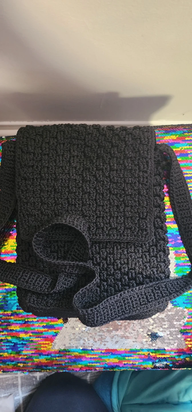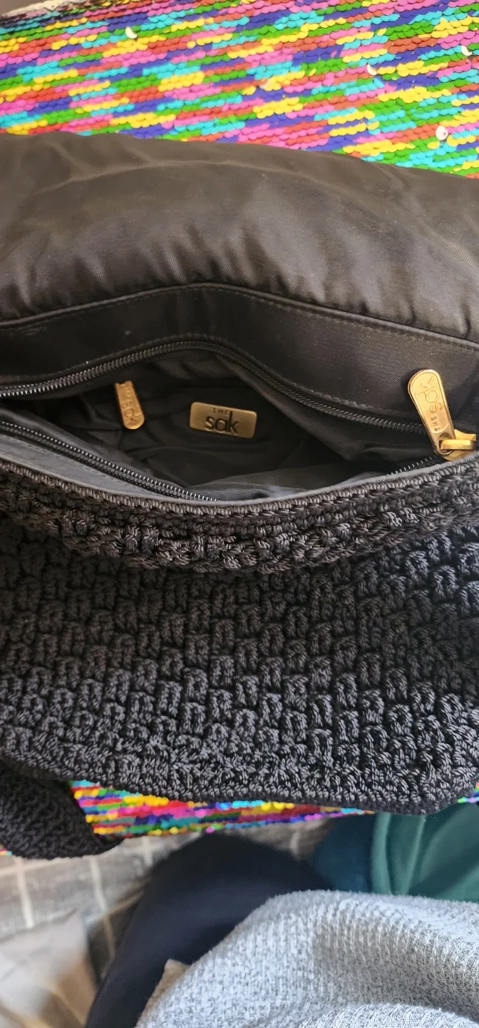 This black crochet shoulder bag from The Sak features a woven exterior and a zippered main compartment. It includes an interior zippered pocket and a flap closure.