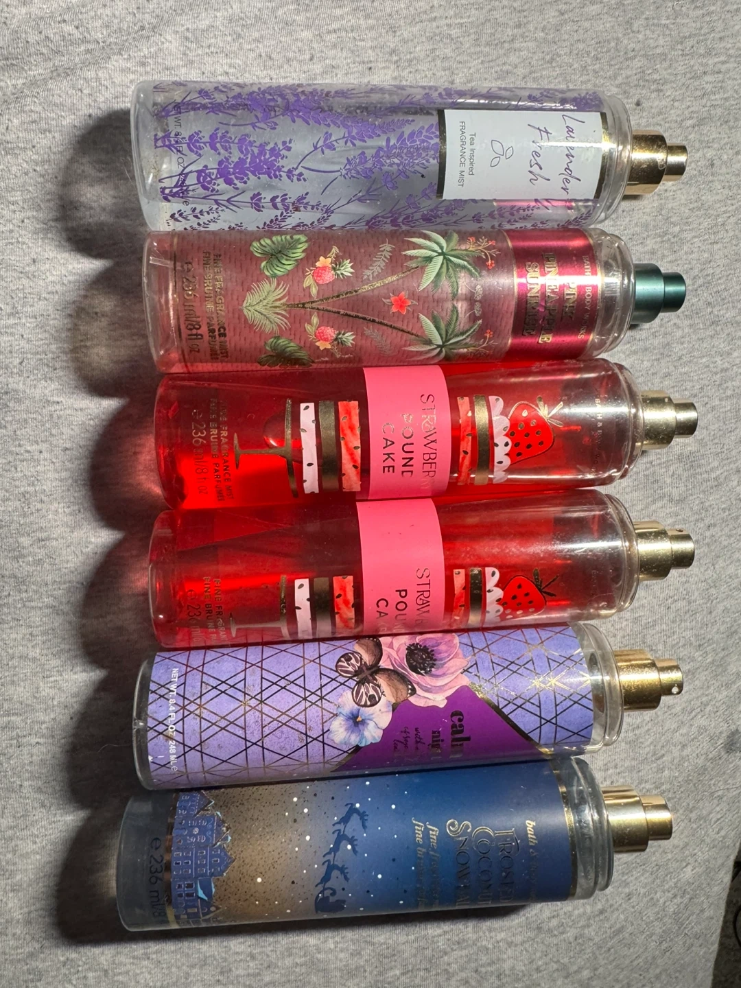 Lot of five Bath & Body Works fine fragrance mists. Includes Lavender Fresh, Pink Apple Tini, Strawberry Pound Cake, Calm, and Frosted Coconut Snowball. Each bottle is 236 ml / 8 fl oz.