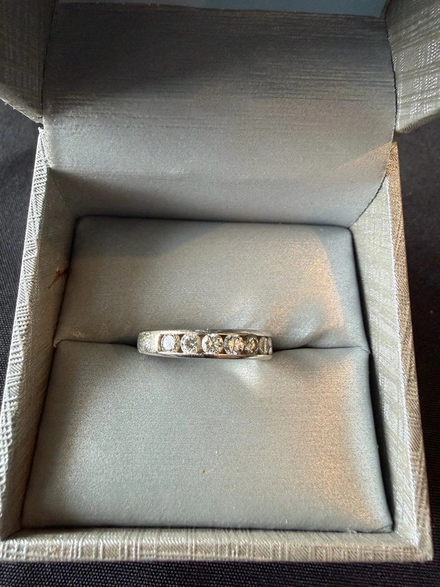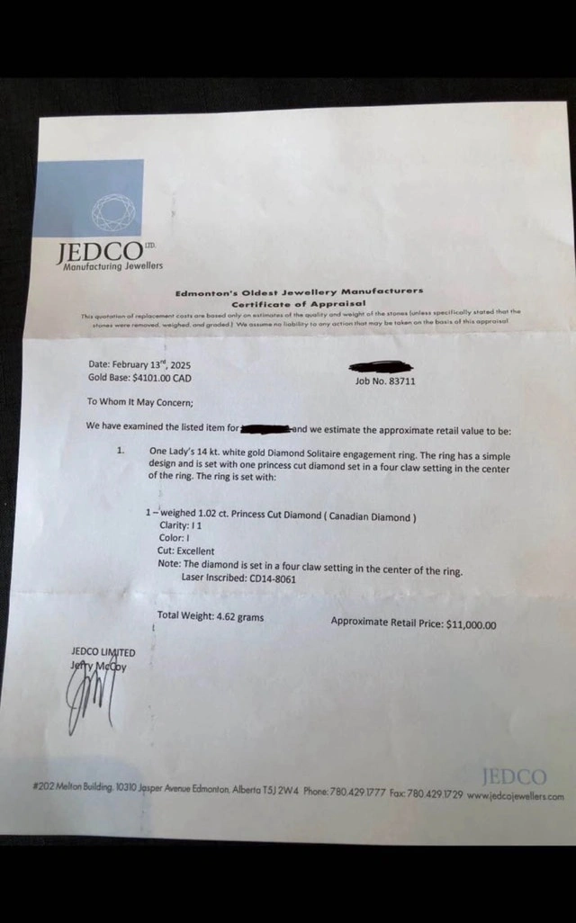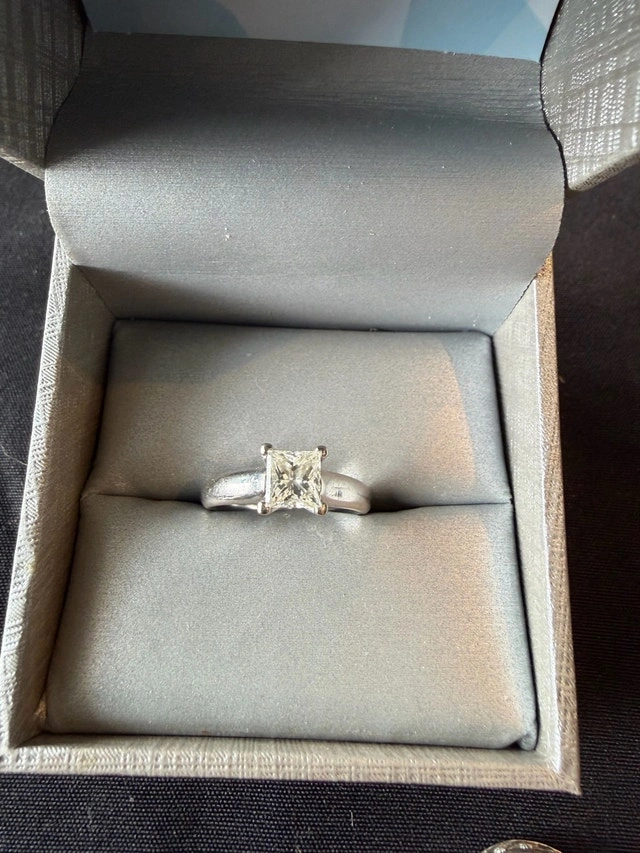 This exquisite Canadian diamond ring features a 1.02ct princess cut diamond with I1 clarity and excellent colour, set in 14kt white gold. The ring is laser inscribed with CD14-8061 and comes with a certificate of authenticity. This ring is in excellent condition. Additional Specifications: * Diamond Shape: Princess Cut * Diamond Weight: 1.02ct * Clarity: I1 * Colour: I (Near Colourless) * Cut: Excellent * Measurements: 5.73 x 5.63 x 3.84mm * Metal: 14kt White Gold. I am pricing this ring at $5,750.00. This ring is so sparkly; you'll feel like royalty! If the ad is still up, the ring is still available.