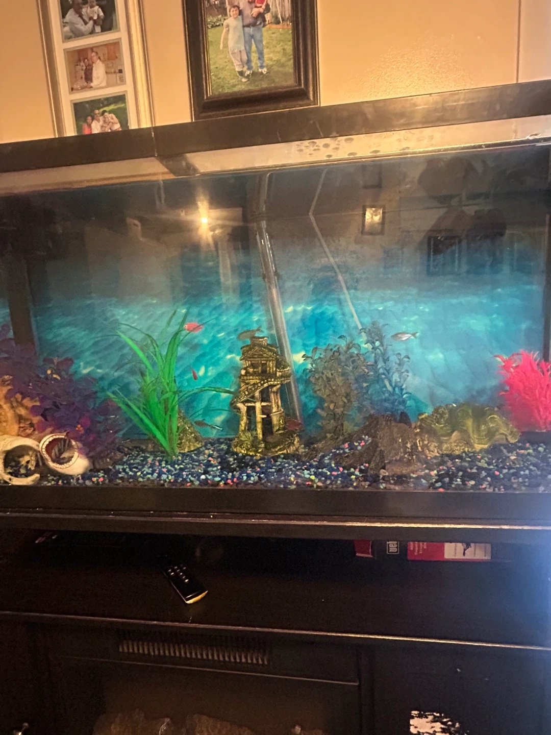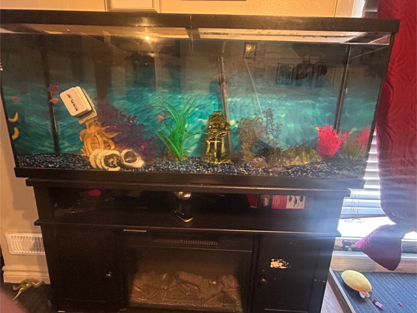 this fish tank comes with literally everything you can think of I have over 20 glow Tetris, which have cost me over $200 alone plus I have an LG eater in there who has grown to be quite big and helps the tank out very good I also have lots of decorations And I have decorations that have air bubbles, and I also have the machine to plug into provide the air bubbles in total I have spent over $1500 on this tank from start to finish. I’m recently moving so I need the tank gone so I’m selling for $200 or best offer. I need it gone as soon as possible Tank also comes with fan inside the water heaters filter everything except for the stand I do not have a stand for this tank. This tank is just fish and accessories and tank for sale. The light recently burnt out so I do not have a light. The fish have not had a light in over three months not that big of a deal but ideally you’d wanna get a black light so your fish glow Send me a message if you have any questions thank you