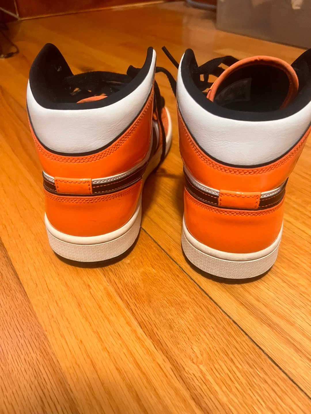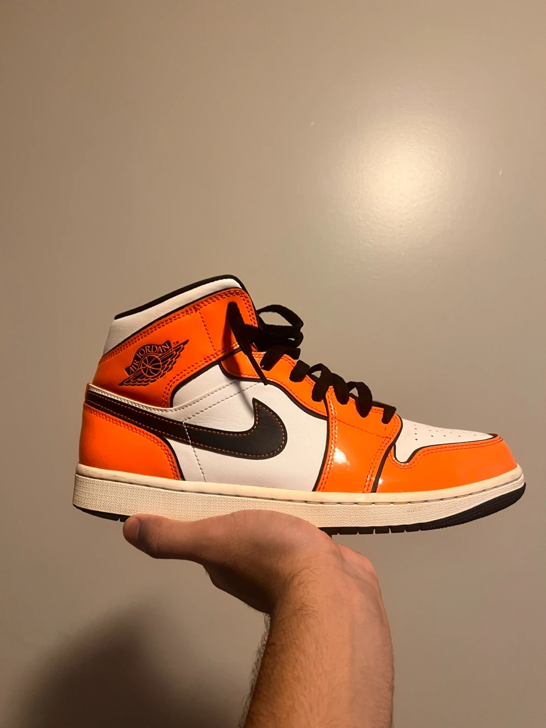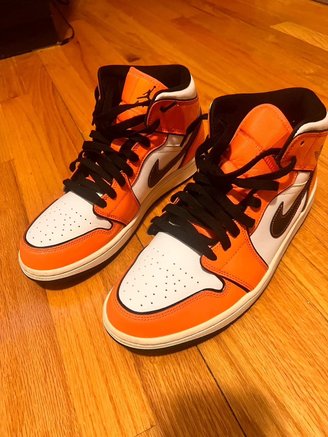 These Air Jordan 1 Mid SE sneakers come in a vibrant orange, white, and black colorway. They're a men's size 10 US. Includes original box. Used.