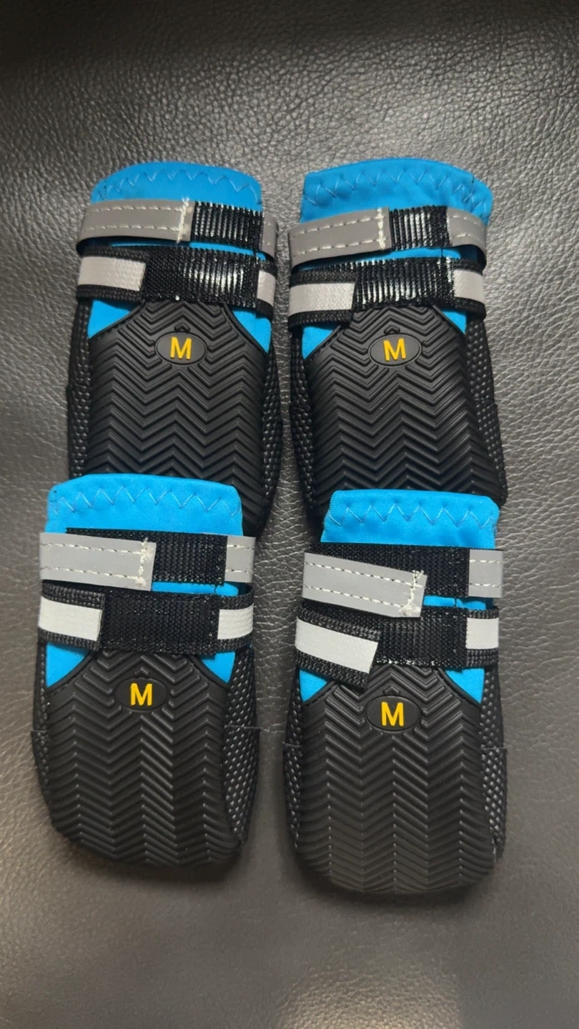 These four dog boots come in a medium size. They're blue and black with reflective straps for visibility. The soles are durable and designed for protection.