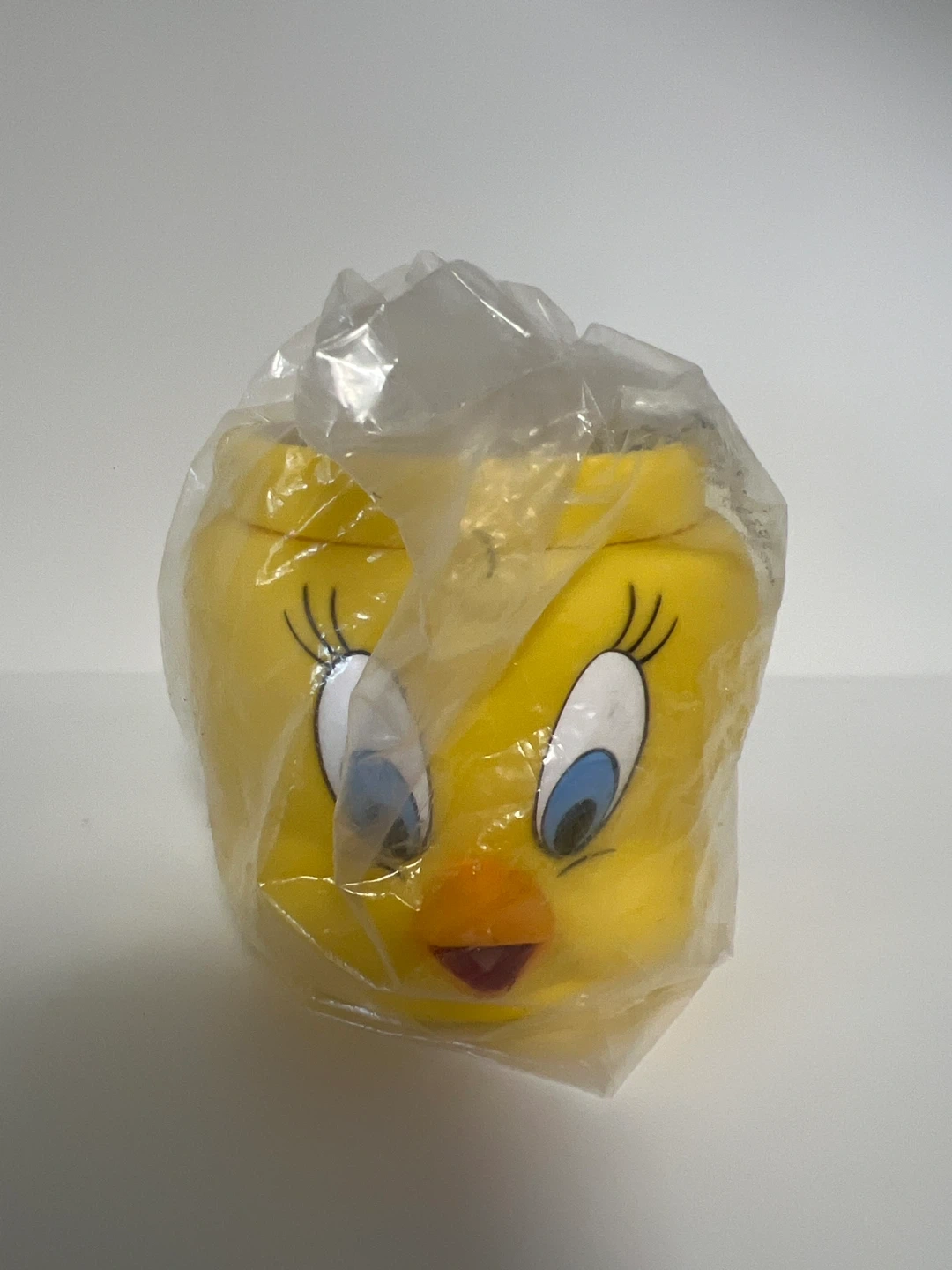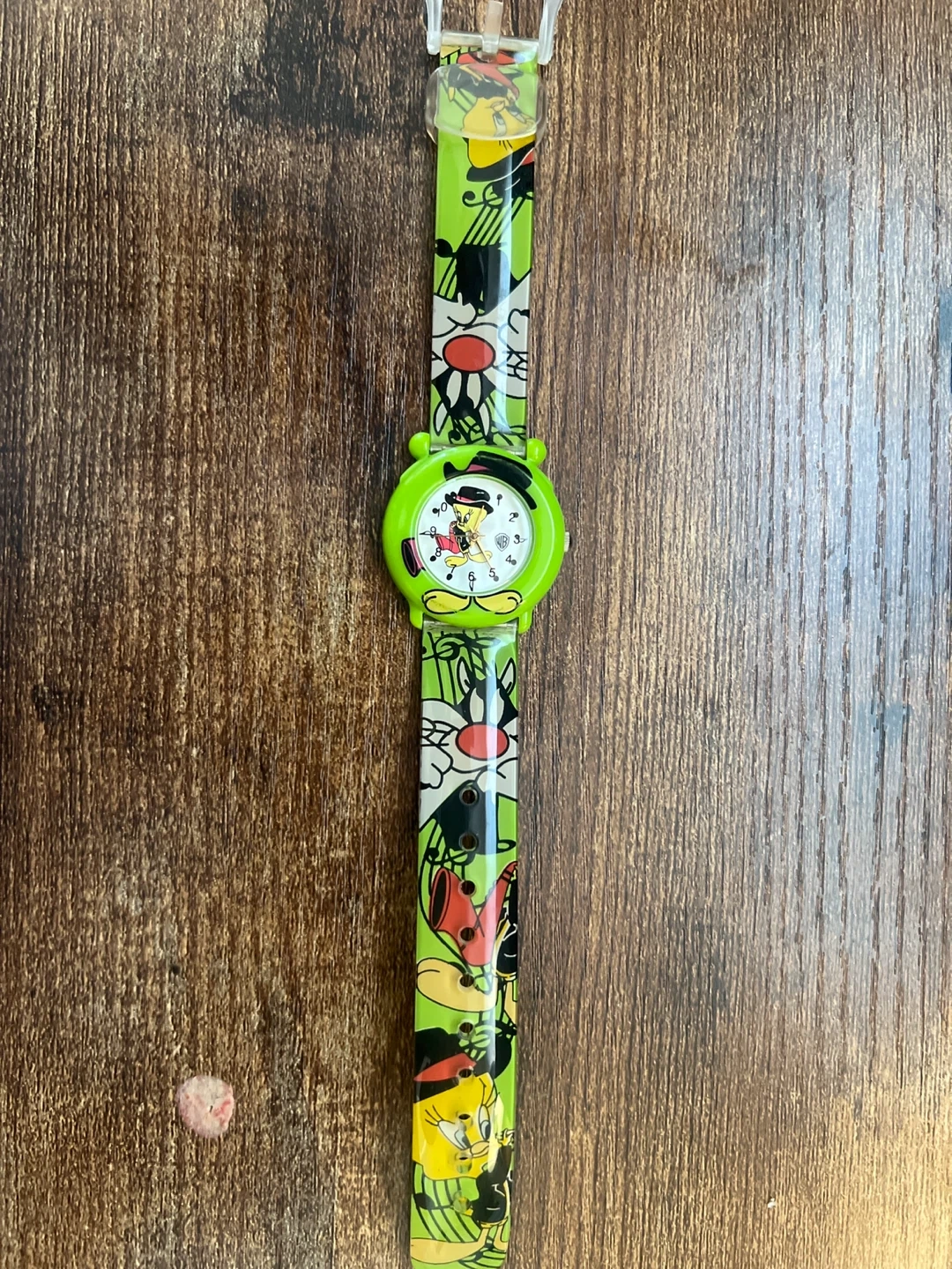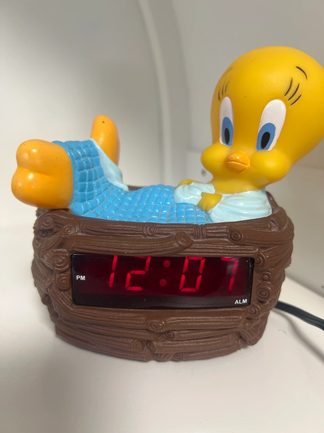 Classic Tweety Bird alarm clock with a nest base and a matching Tweety Bird watch. Both are yellow plastic with colourful graphics. The alarm clock displays time digitally and the watch is analog. Warner Brothers watch Sylvester and Tweety, Looney Tunes collectors Tweety mug. selling as a tweety bird set great for any collector.