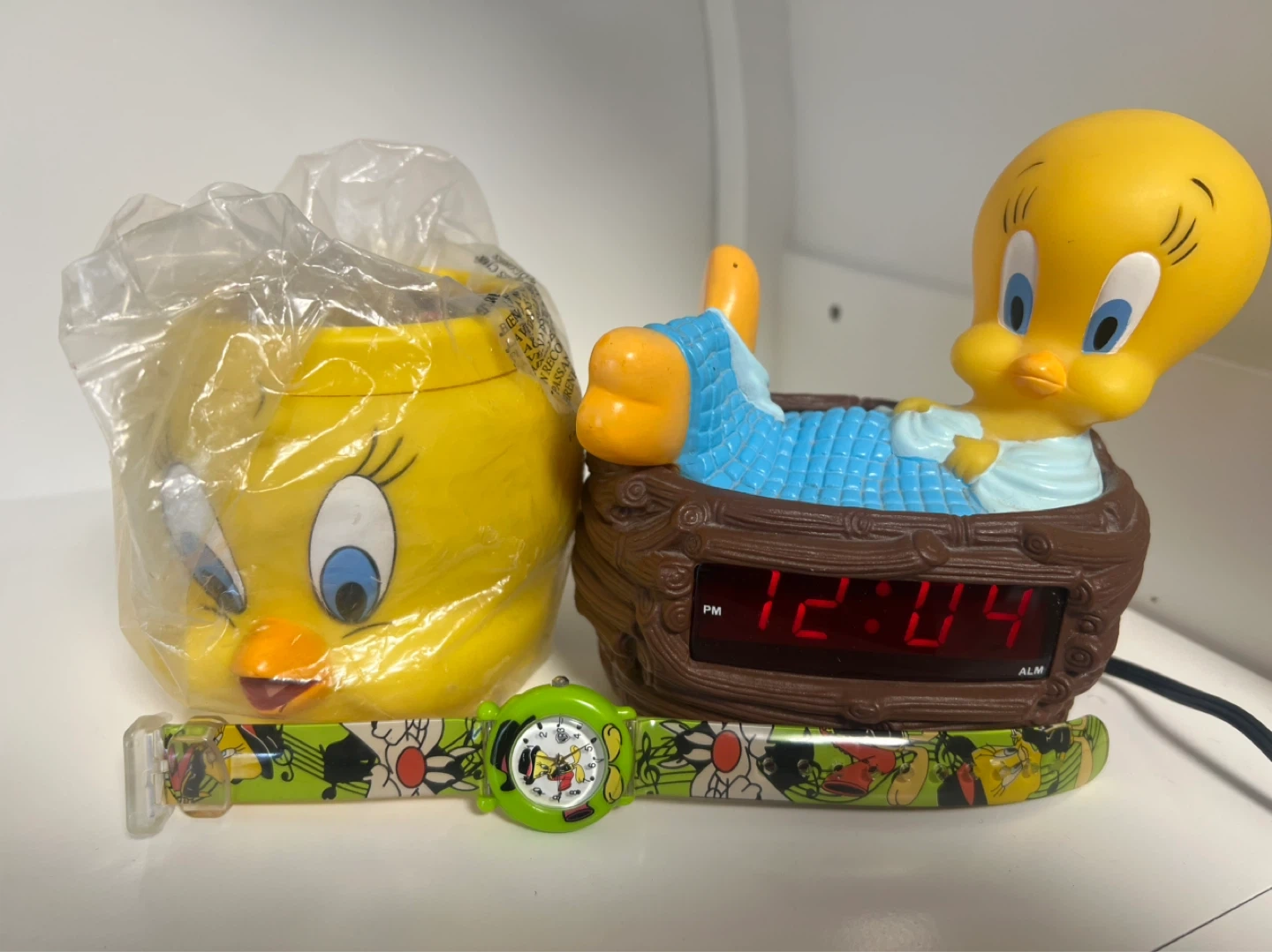 Vintage Tweety Bird Alarm Clock and Watch Set and collectors mug